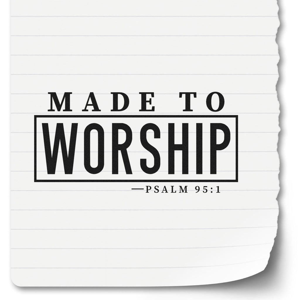 Bold black lettering proclaims “MADE TO WORSHIP” on a clean white impression, with “MADE TO” in a classic serif above, “WORSHIP” standing tall in a modern condensed font inside a simple rectangle, and a slim line leading to the scripture reference “PSALM 95:1” beneath. The result is a striking, faith-forward design that looks thoughtfully styled on every piece you create.