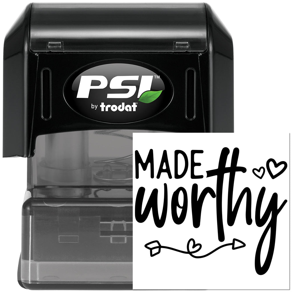 Q Fall in love with every impression — the PSI Pre-Inked MADE worthy Hearts Stamp puts a bold, playful black script "MADE worthy" on white into your hands, complete with two tiny hearts above "worthy" and a charming curling arrow with a heart loop. Perfectly sized at 1-5/8" square, this pre-inked heart stamp delivers polished, whimsical branding that delights customers and adds instant handmade charm to gifts and orders.