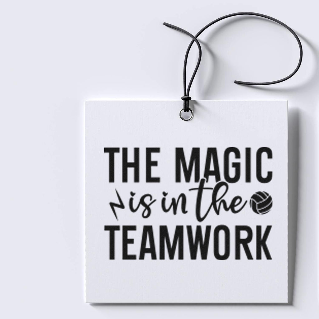 The bold black-and-white design proclaims “THE MAGIC TEAMWORK” in all caps, with the playful “is in the” scripted across the center, tiny hearts dotting the i’s, a lightning-bolt flourish, and a volleyball standing in for the “o” in TEAMWORK — all scaled to a neat 1-5/8" square for polished, readable place cards.