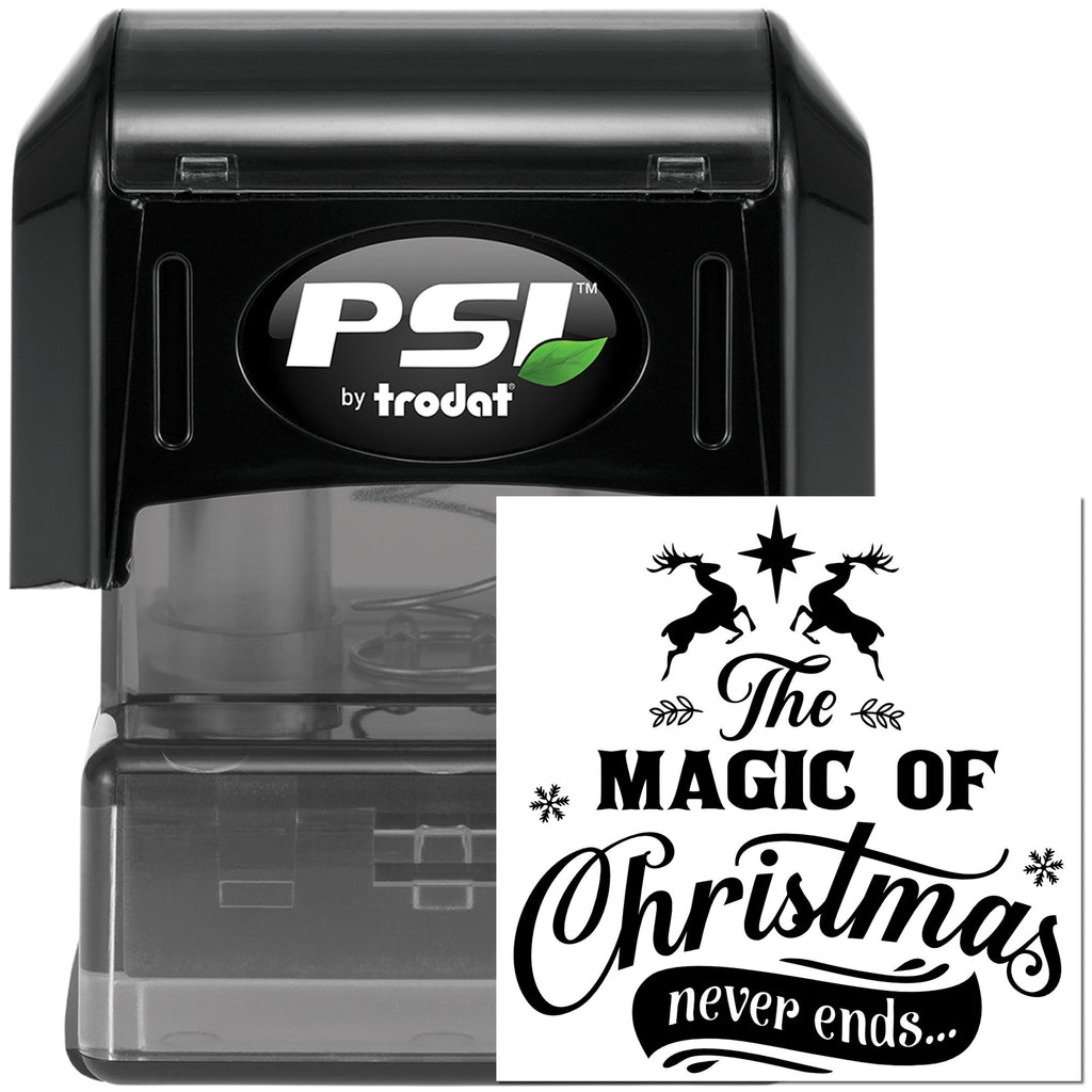 Two joyful reindeer prance beside a radiant eight-point star, all nestled above the phrase “The magic of Christmas,” while “Christmas” stands out in bold, ornate lettering. Delicate snowflakes, greenery accents, and a curved ribbon that reads “never ends…” complete the design, giving every impression a nostalgic, keepsake feel that delights kids, customers, and grandparents alike.