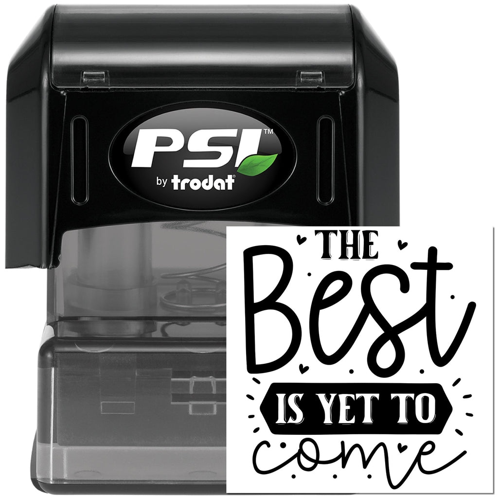 Meet the PSI Pre-Inked Motivational Decor Poster Paper Goods Stamp — a 1-5/8" square spark of joy that stamps “The Best Is Yet to Come” in bold black-and-white typographic style with chunky sans, swoopy script, hearts and dots for a clean, upbeat look that pops on posters, notes, and bulletin boards.
