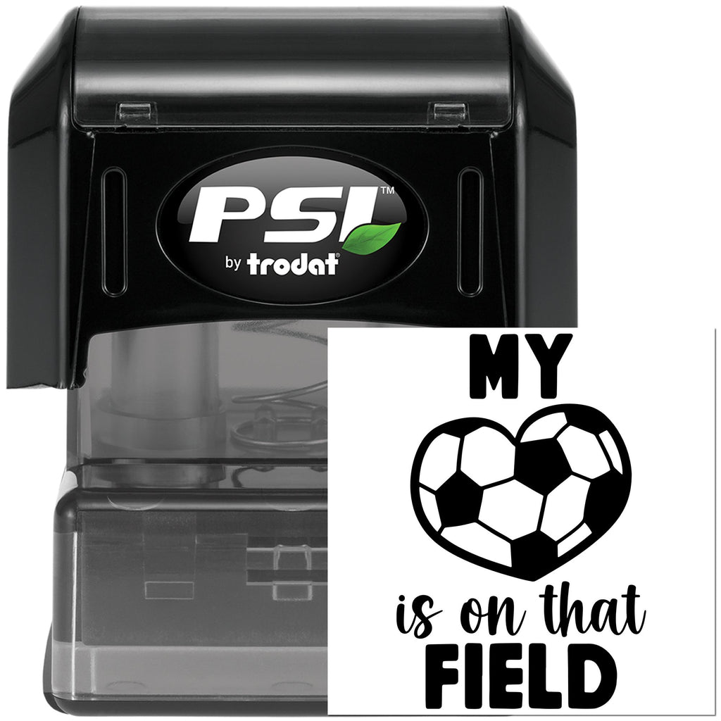 Meet the Pre-Inked My Heart Field Favor Tag Stamp — a playful 1-5/8" square stamp that pops with personality: a cheeky “MY” tops a heart filled with soccer-ball panels, with “is on that FIELD” dancing beneath in cursive and bold block letters — perfect for sporty wedding favors, soccer team events, and themed party tags.