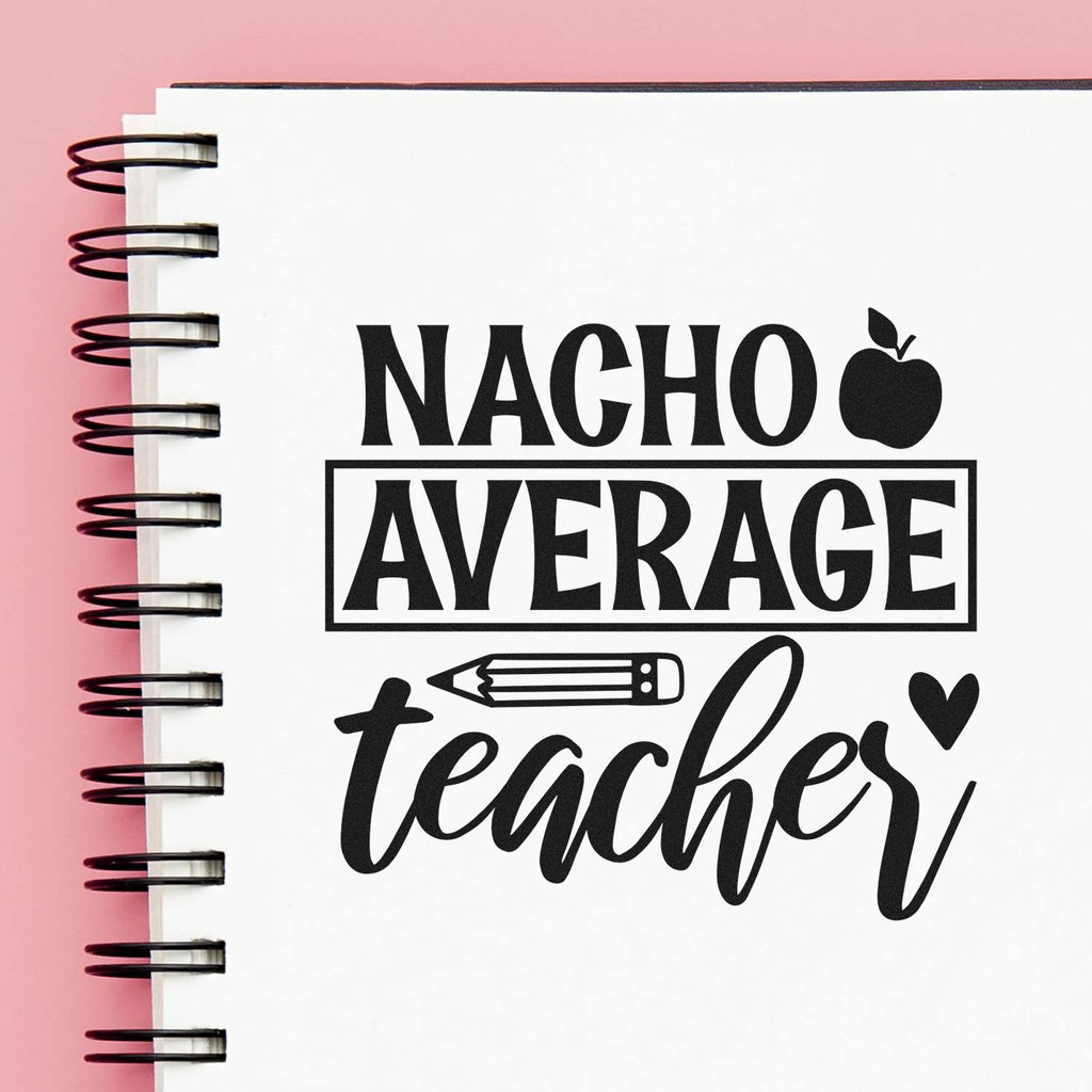 - Playful design: Bold “Nacho Average Teacher” caps, breezy script, apple icon, pencil bar, and tiny heart create a warm, relatable look perfect for elementary teachers and crafters.