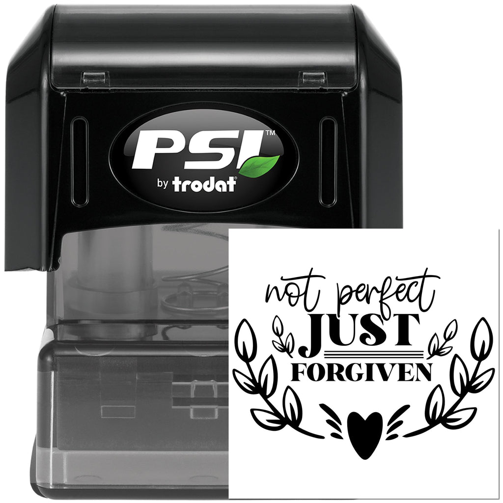 Rediscover the joy of faith-filled crafting with the Pre-Inked Not perfect — Forgiven Scrapbook Stamp: a 1-5/8" square, hand-lettered banner reading “not perfect” above the playful “JUST FORGIVEN,” framed by tiny leaf laurels and a heart with stylized wings for a sweet, uplifting focal point.