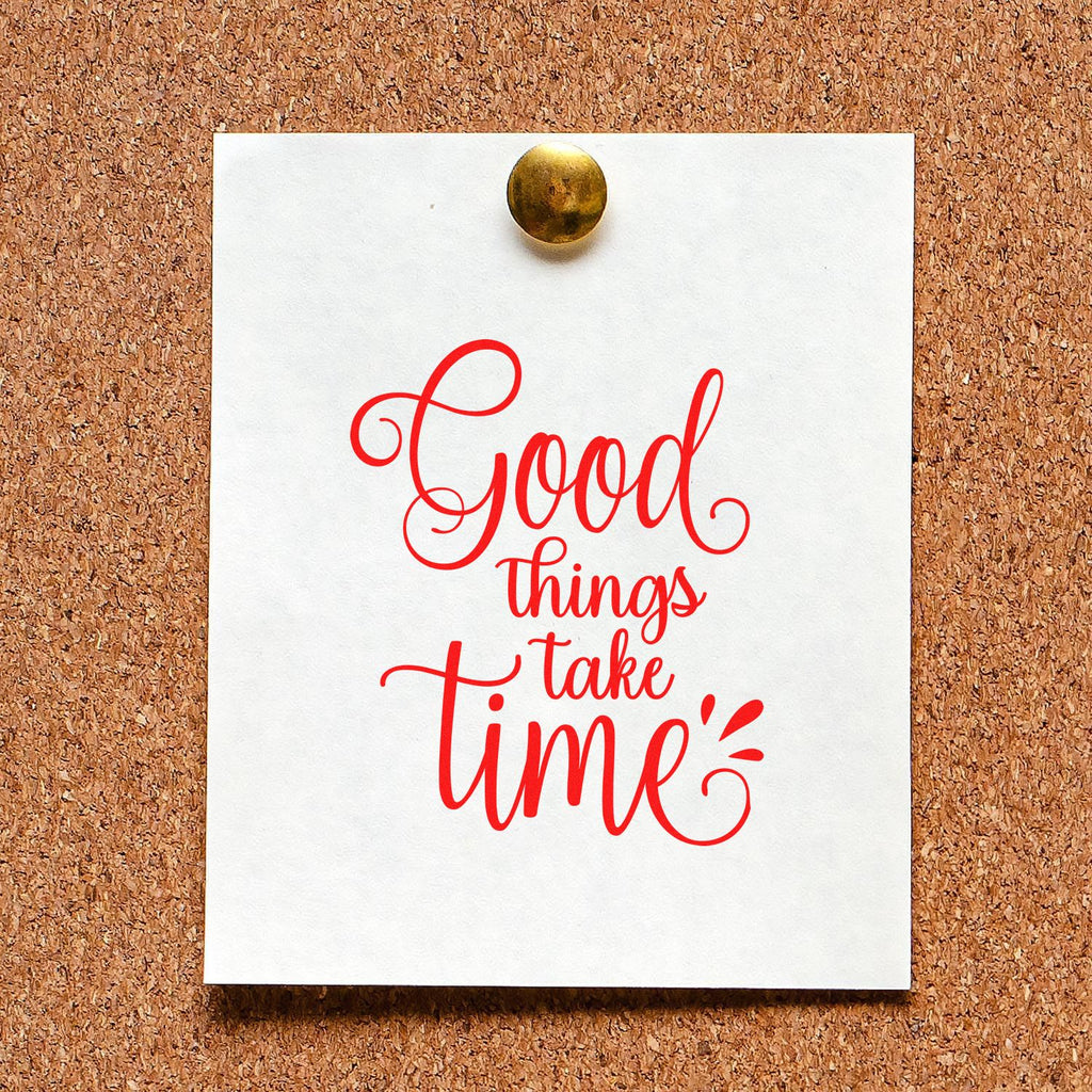 Discover the Pre-Inked Patience Pays Off Paper Craft Stamp — a 1-5/8" square delight that stamps the hand-lettered motto “Good things take time” in swoopy, calligraphic black for instant, uplifting focal points on cards and scrapbook pages.