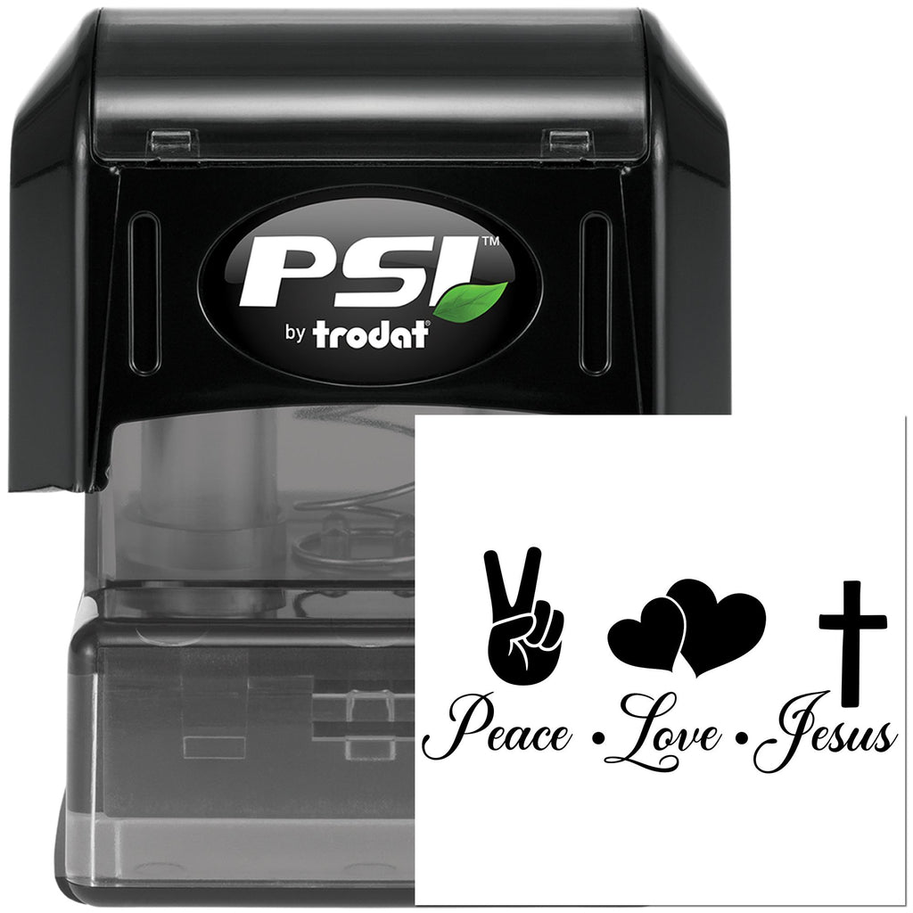 Overflow your cards with joy using the PSI Pre-Inked Peace Love Jesus Card Making Stamp—vibrant, crisp impressions in a compact 1-5/8" square that bring faith-forward messages to life with playful, high-contrast artwork: a bold peace-hand, two overlapping hearts, and a simple cross with elegant “Peace · Love · Jesus” script beneath.