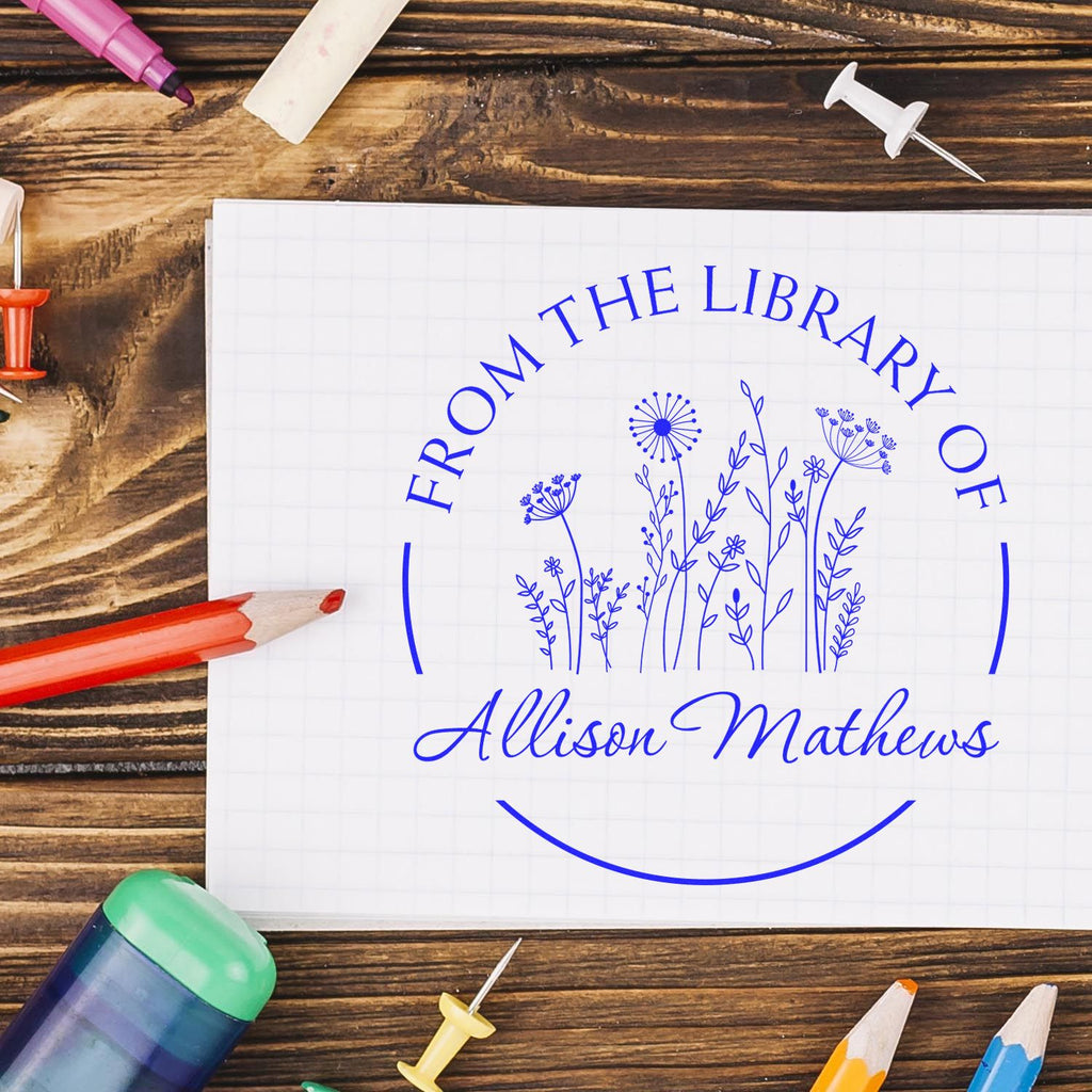 A Touch of Elegance Our Pre-Inked Petalicious Flowers Customized Belongs To Stamper features a beautiful design with a center image of wildflowers, surrounded by elegant text. The clean round design includes phrases such as "This Book Belongs To," "From The Library of," and "Ex Libris" at the top arc, followed by your name or a personalized saying under the center image. The impression size is a perfect 1-5/8" in diameter, making it ideal for a variety of surfaces.