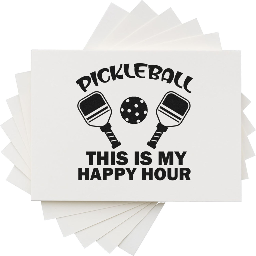 The whimsical design features two playful paddles facing off on a clean white backdrop, a bold arched banner reading “PICKLEBALL,” and chunky text declaring “THIS IS MY HAPPY HOUR,” perfect for stamping practice sessions, match results, hydration reminders, drill ideas, and tournament night-out recaps.