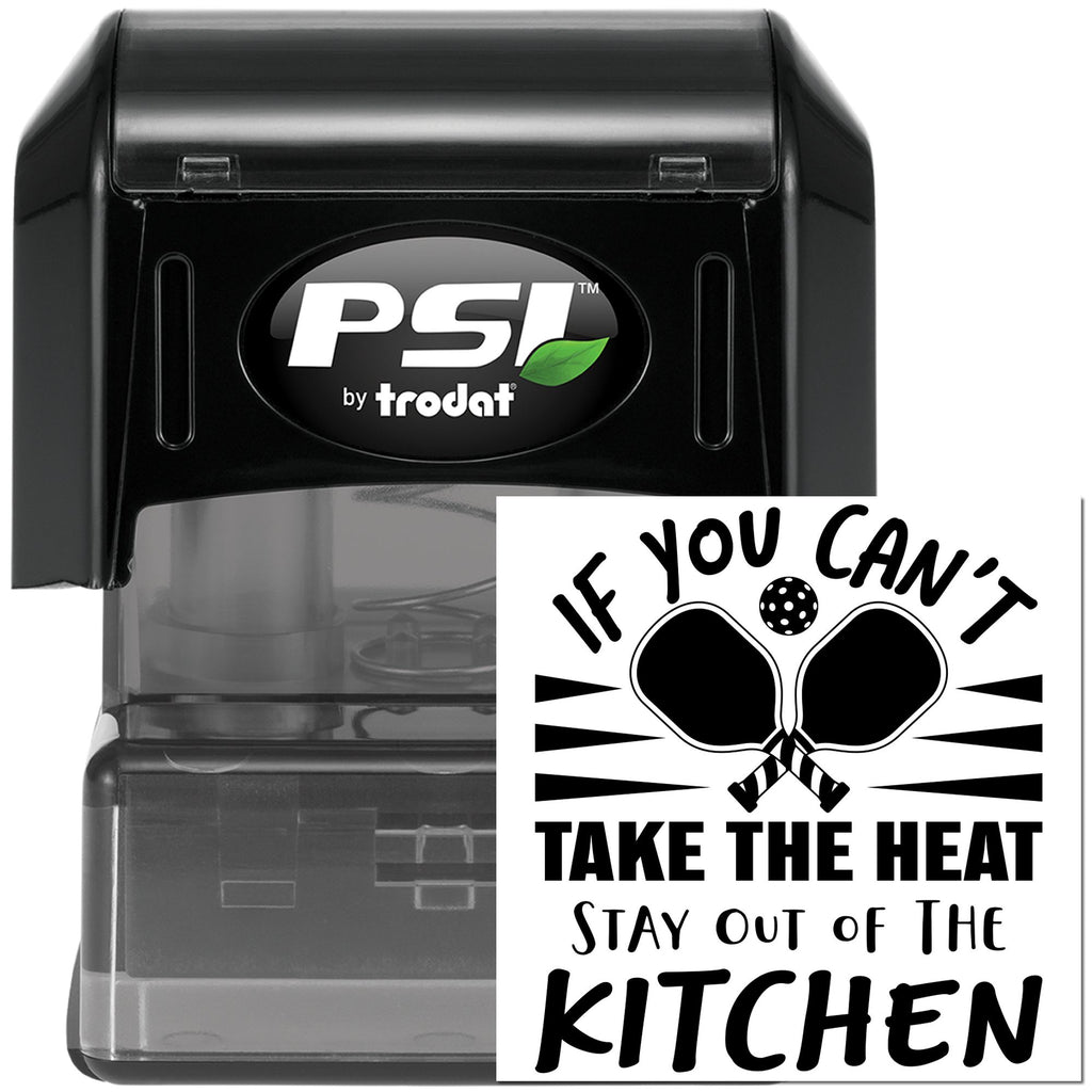 Precision pre-inked technology delivers razor-sharp impressions (up to 15,000 crisp prints) in five vibrant ink colors, so your cheeky design — two crossed paddles framing a dotted ball with the slogan “If you can’t handle the heat, cool it and stay off the court.” — pops with bold black-and-white contrast or colorful flair on demand.