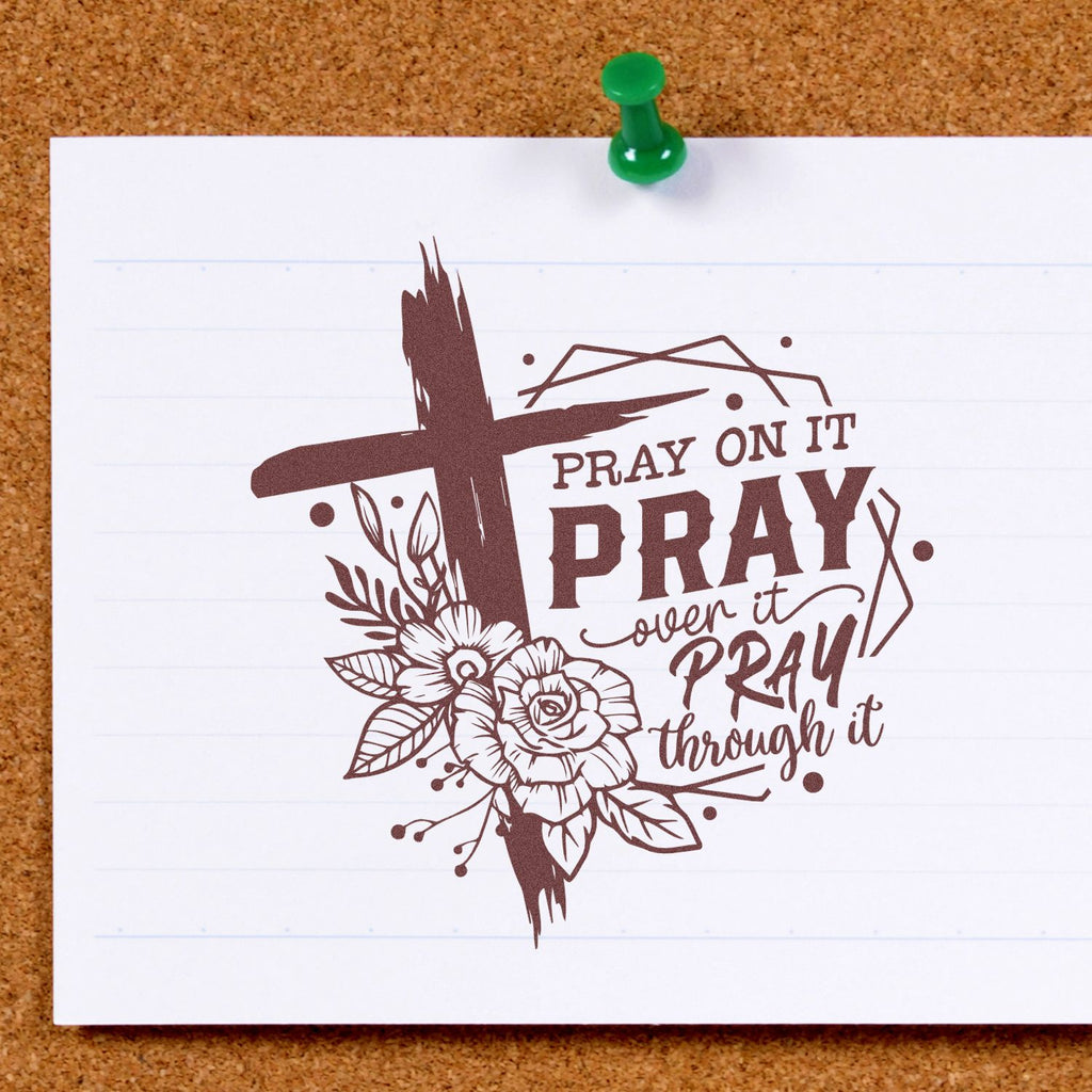 This 1-5/8" square Pre‑Ink Pray On It Postcard Stamp pairs professional PSI pre-inked performance with a faith-forward design: a bold hand‑painted cross anchoring roses and greenery, playful lettering that reads “Pray on it, pray over it, pray through it,” and modern geometric accents for a clean, contemporary look.