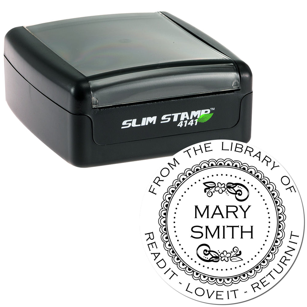 Impressive Design Features This library stamp features a center image of a Preppy Name with a circular design. The clean round design includes phrases such as "This Book Belongs To," "From The Library of," and "Ex Libris" at the top arc, followed by your name or another saying at the bottom arc. The impression size is 1-5/8" in diameter, making it the perfect size for any book.