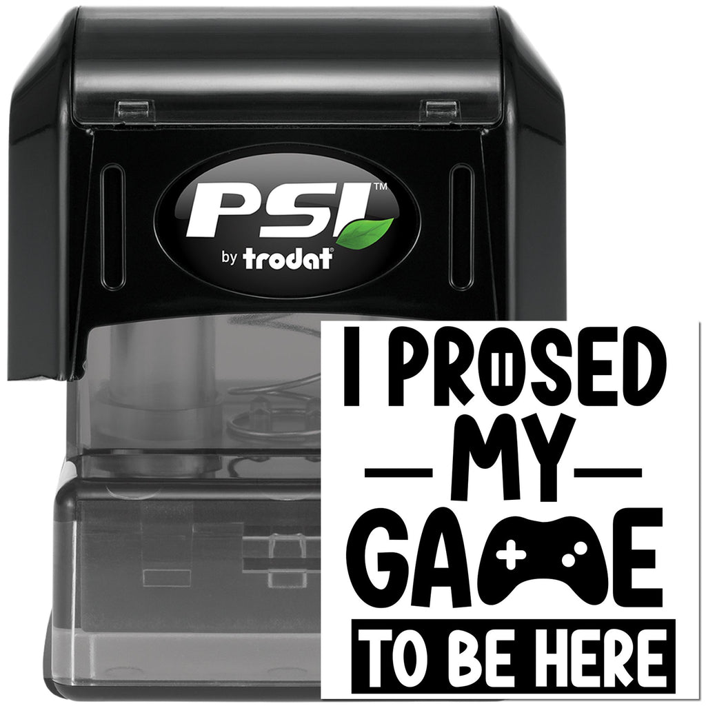 Level up your crafting with the Pre-Inked Proved My Game Greeting Card Stamp — a 1-5/8" square pre-inked gaming stamp that lays down bold black lettering on white: “I PROSED MY GAME TO BE HERE,” with a playful controller icon replacing part of GAME and a subtle drop shadow for instant visual pop.