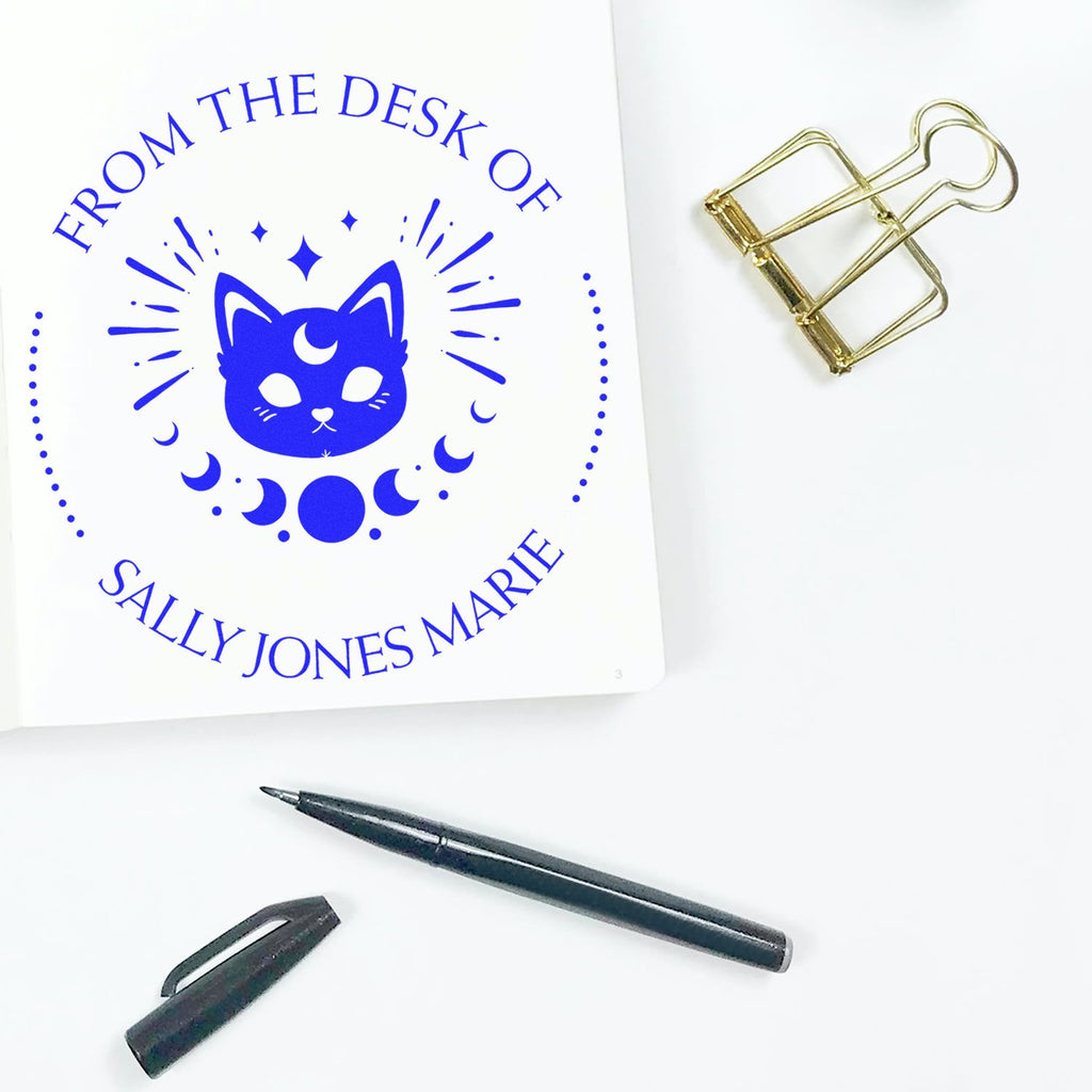 Key Features: - Design: Radiant Cat with celestial elements - Size: 1-5/8" in diameter - Impressions: Up to 15,000 high-quality impressions - Ink Colors: Red, Blue, Green, Purple, Black - Perfect for: Personalizing your cat's belongings and books - Ideal Gift: For cat lovers and book enthusiasts