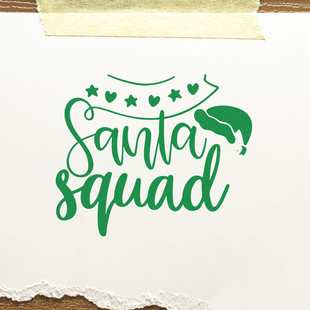 Jingle all the way into the holiday season with our Pre-Inked Santa Squad Crew Paper Craft Stamp! This festive 1-5/8" square stamp features vibrant, looping calligraphy that reads “Santa Squad” on a crisp white backdrop, topped with a playful Santa hat and a twinkling string of stars and hearts—perfect for adding instant cheer to any project.