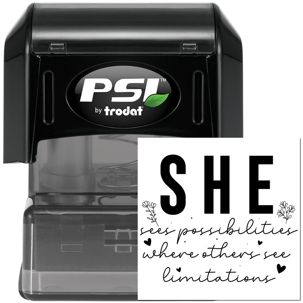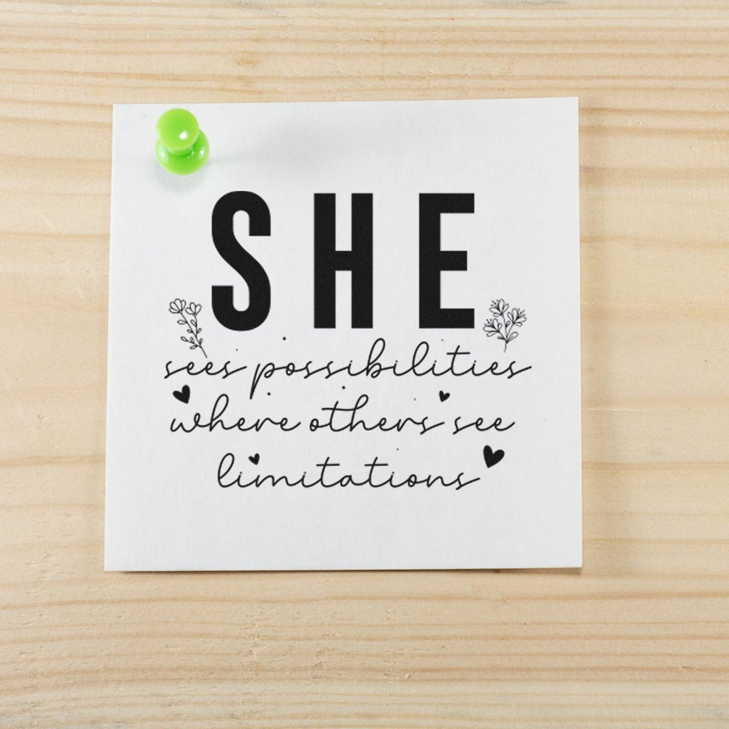 Wrapped in confident black-on-white contrast, the 1-5/8" She Sees Possibilities Pre-Inked Journaling Stamp features a bold "SHE" at the top with a playful cursive line that whispers "spotting every possibility where others shout limits," finished with tiny hearts and floral doodles for a fresh, minimalist badge of empowerment.