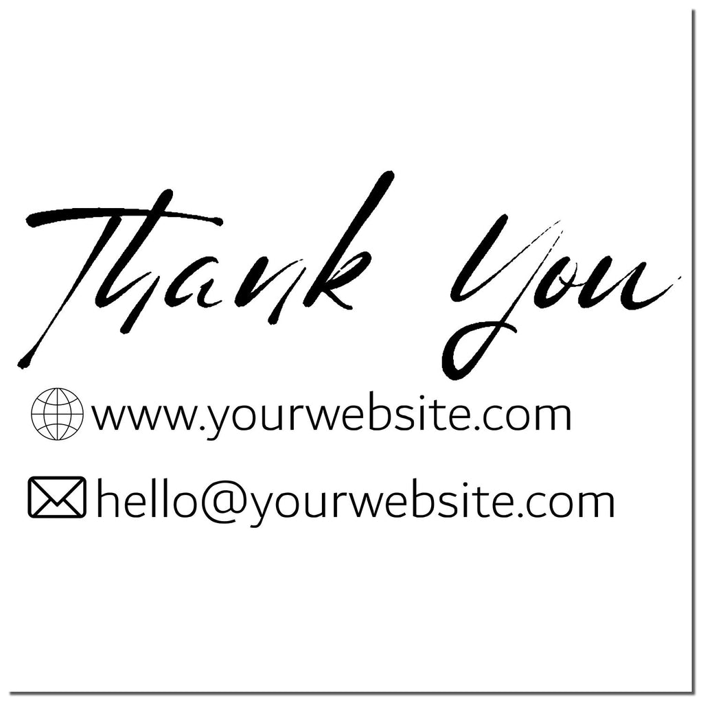 Crafted with precision, this 1-5/8" square stamp features a sophisticated handwritten "Thank You" design, complemented by your custom contact details. The flowing script adds a touch of warmth to every impression, while professional icons highlight your website and email information.
