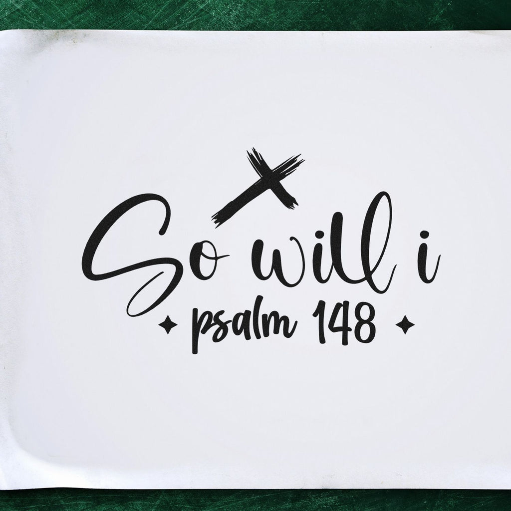 QBring bold faith-filled flair to every page with the Pre-Inked "So Will I" Paper Craft Stamp — a 1-5/8" square powerhouse that lays down a dramatic brushstroke cross, playful black script reading “So will I,” and a hand-lettered “Psalm 148” framed by tiny diamonds on crisp white for a clean, modern look.