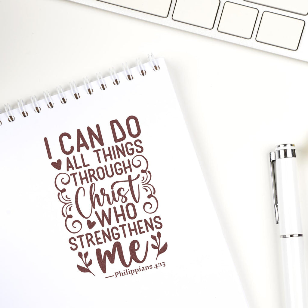 Featuring a charming black-and-white design, this 1-5/8" square stamp showcases a beloved Bible verse in chunky lettering paired with breezy cursive, surrounded by swirls, hearts, and leafy doodles, with “Philippians 4:13” tucked neatly beneath. Every impression becomes a mini art print that stands out on journal margins, sermon notes, classroom worksheets, and devotion planners.