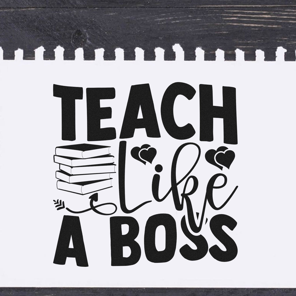 Designed for busy K–12 teachers and parents, this compact 1-5/8" square stamp delivers a crisp, professional impression in seconds—no separate ink pad needed. A bold black-and-white graphic features a stack of books, playful hearts, and a looping arrow surrounding the phrase “TEACH LIKE A BOSS” in a mix of block and script fonts, creating an energetic, modern look that stands out on any paper surface.