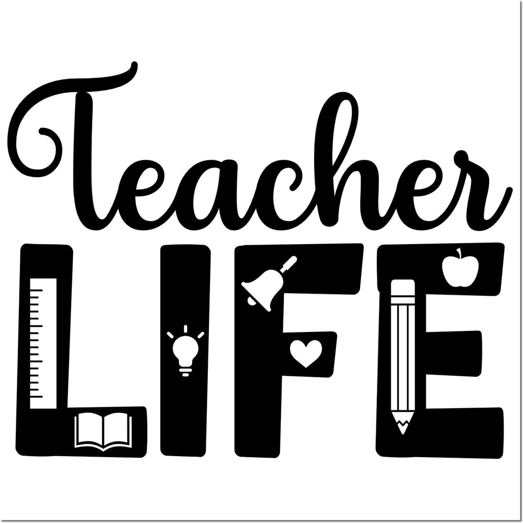 Juggle less and love “teacher life” more with this Pre-Inked Teacher Life Illustration Tag Stamp, designed to make every stack of papers and every parent note faster, cuter, and way more fun. This 1-5/8" square stamp showcases a lively “Teacher Life” banner where each letter hides a school-themed icon—L with a ruler and book, I with a bright idea bulb, F with a ringing heart-touched bell, and E topped with a pencil and apple—all in bold monochrome black on white for a crisp, professional look.
