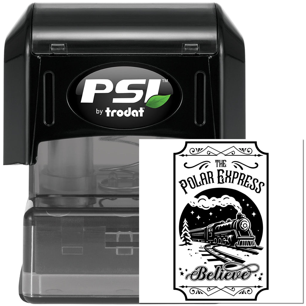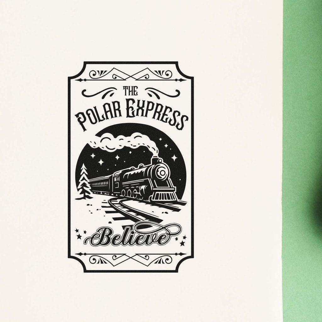 The 1-5/8" square stamp features a joyful steam locomotive steaming across a snowy, starry night with tall pines, elegant “The Polar Express” lettering and a tiny, heartwarming “Believe” wink beneath—perfect for cards, tags, storytime props, and craft centers.