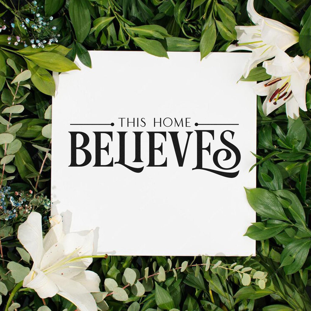 Enjoy up to 15,000 flawless impressions before re-inking thanks to luxurious oil-based ink that stamps smoothly and whisper-quietly; every impression shows the bold uppercase "THIS HOME" with a larger, stylized "BELIEVES" beneath and playful dash-and-circle accents for modern-minimalist charm with a wink of whimsy.