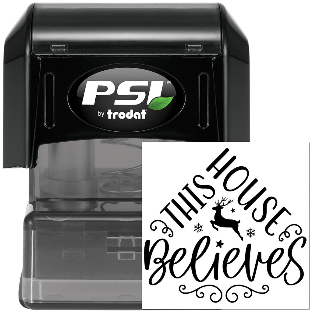 Joy starts at your mailbox with our Pre-Inked “This House Believes” Card Stamp, the festive must-have for parents and teachers who want holiday magic in every impression. This 1-5/8" square christmas card stamp features a playful reindeer leaping through swirling party flourishes, with “THIS HOUSE” arched boldly above and “believes” in a fun, looping script below, all sprinkled with tiny stars and snowflakes for a cozy, wintry feel that shouts holiday cheer.