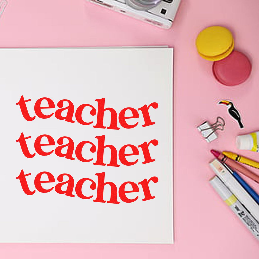 Three playful “teacher” words stack up on a bright white background in a bold, gently curved serif font that tilts with a friendly wink. The repeated layout keeps your role front and center, creating a signature look students will instantly associate with guidance, reminders, or praise. It’s a fun, modern twist on the classic teacher grading stamp that kids will look for and love.