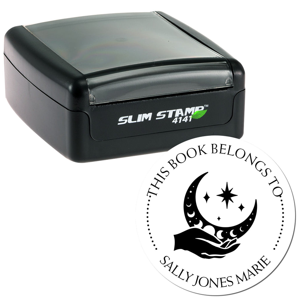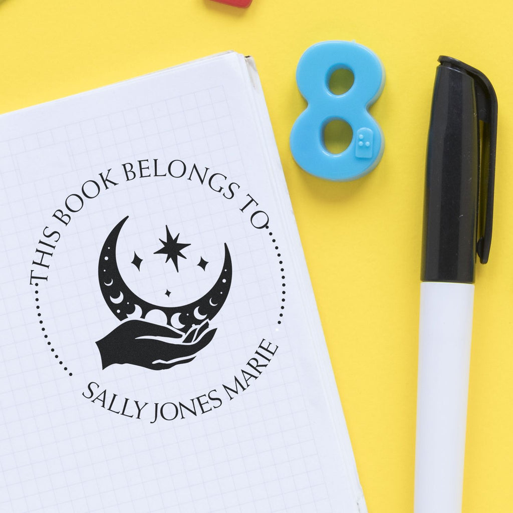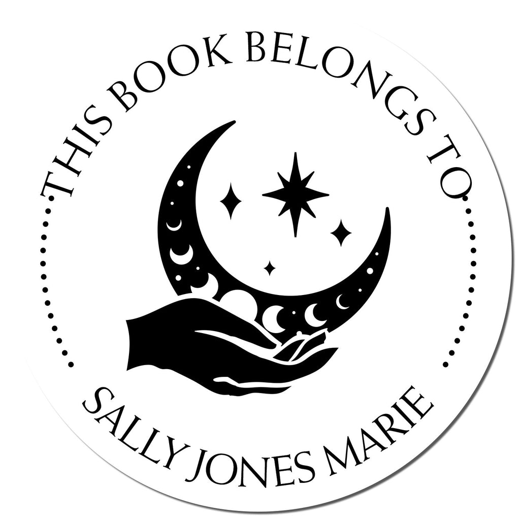 Personalize Your Book Collection Transform your library into a unique reflection of you! Our personalized book property stamper is perfect for marking your ownership of books, ensuring they come back to you after lending them out. With phrases like "This Book Belongs To," "From The Library of," and "Ex Libris" elegantly displayed, you can customize the bottom arc with your name or a special saying. The center image of a Vivid Sky Moon cradled by hands and stars adds a touch of magic to your books, making them not just identifiable but also visually stunning.