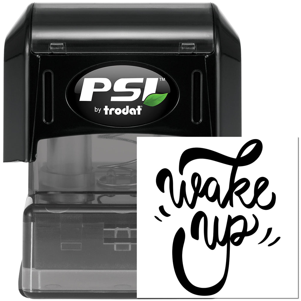 QWake up your day—and your customers—with the Pre-Inked Wake Up Call Mini Card Stamp: a 1-5/8" square powerhouse that prints a bold, bubbly “wake up” in chunky black ink with playful swirls and spark lines for instant energy on every mini card or worksheet.
