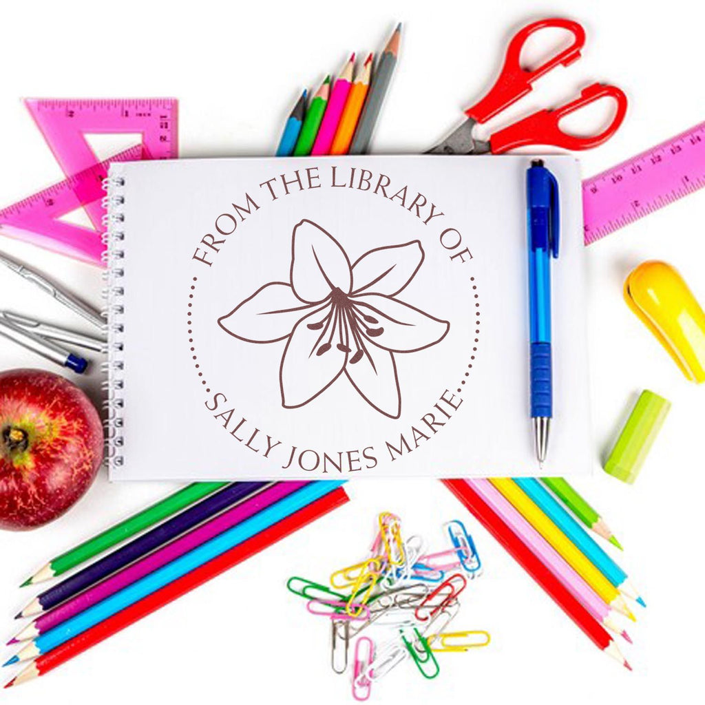 Why Choose Our Customized Book Stamp? This isn’t just any stamp; it’s a statement! Measuring 1-5/8" in diameter, our stamp is compact yet impactful. The design includes the phrase "This Book Belongs To" or "From The Library of" elegantly curved around the top arc, with your name or a special saying at the bottom arc, separated by a charming line of dots. The whimsical flower at the center adds a touch of nature’s beauty, making your stamp unique and personal.