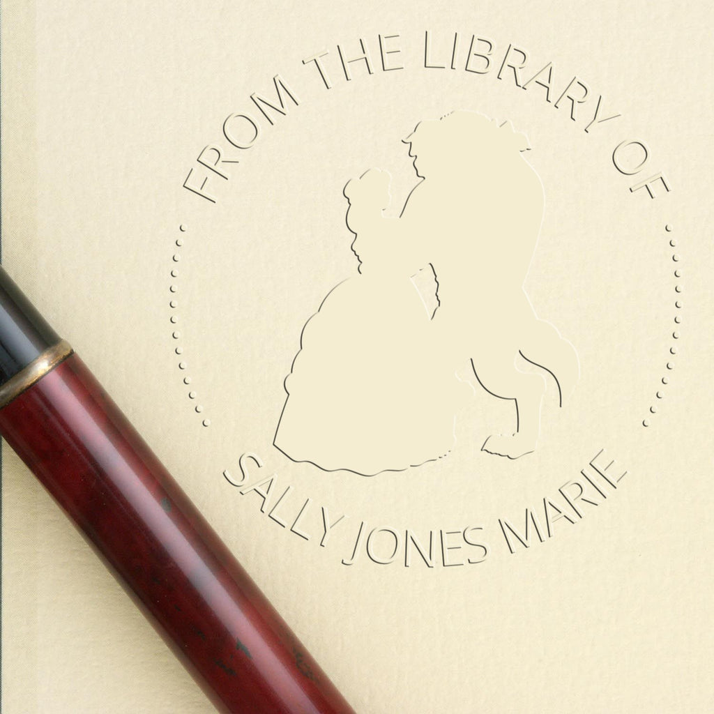 Crafted with precision and elegance, this custom-made belongs to the library of embosser showcases a stunning circular design with intricate details that capture the essence of the timeless tale. The romantic dance scene is beautifully framed within a sophisticated border, making each impression a work of art.