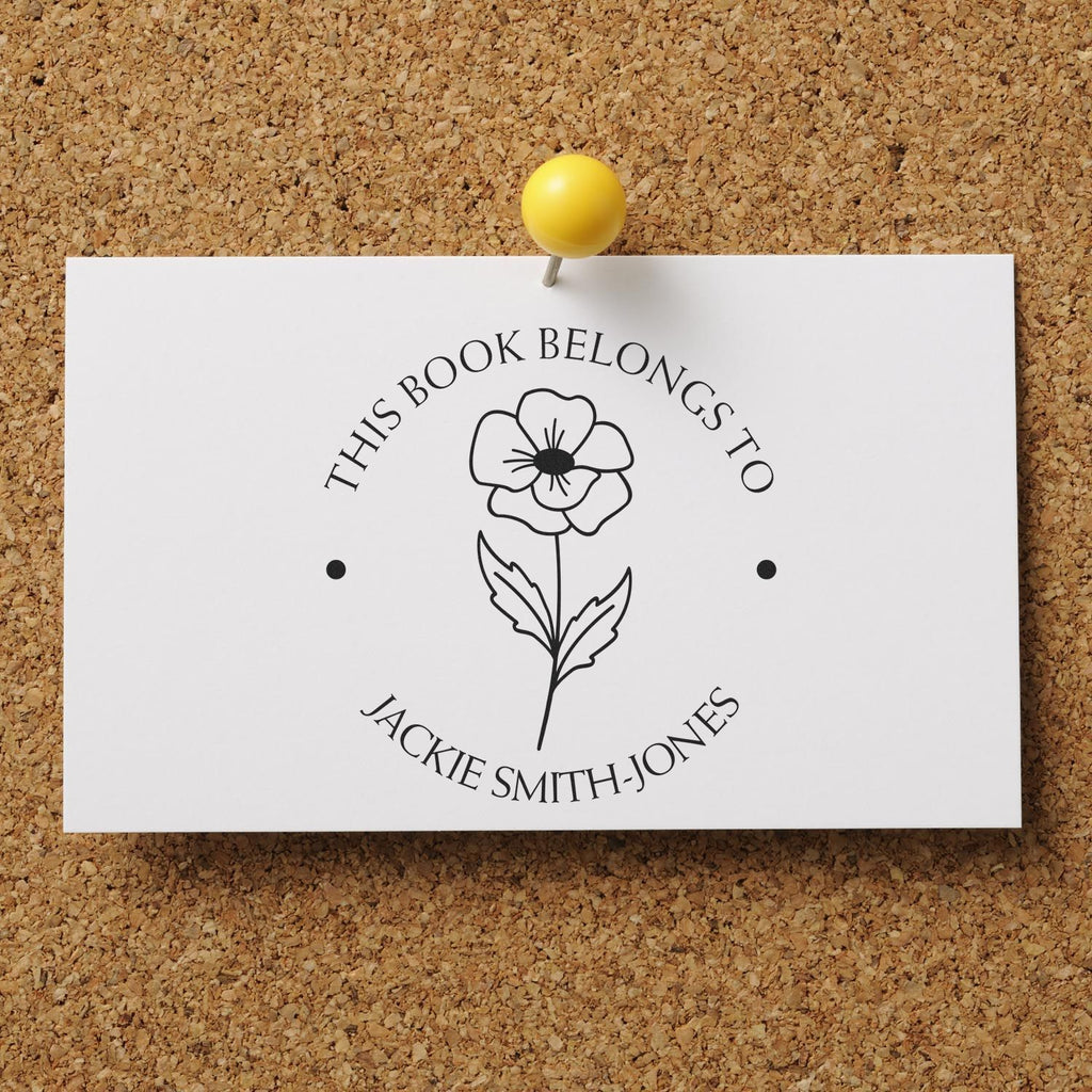 Elegant Design with Personal Touch The design of our library stamp features the beautiful August birth month flower, the Poppy, at its center. This clean, round design includes phrases such as "This Book Belongs To," "From The Library of," and "Ex Libris" elegantly displayed in an arc at the top, with your name or a custom saying at the bottom arc. The two dots separating the text add a touch of sophistication, making your stamped books not only identifiable but also visually appealing. With an impression size of 1-5/8" in diameter, this stamp is perfectly sized for any book cover, ensuring that your personalization stands out beautifully.