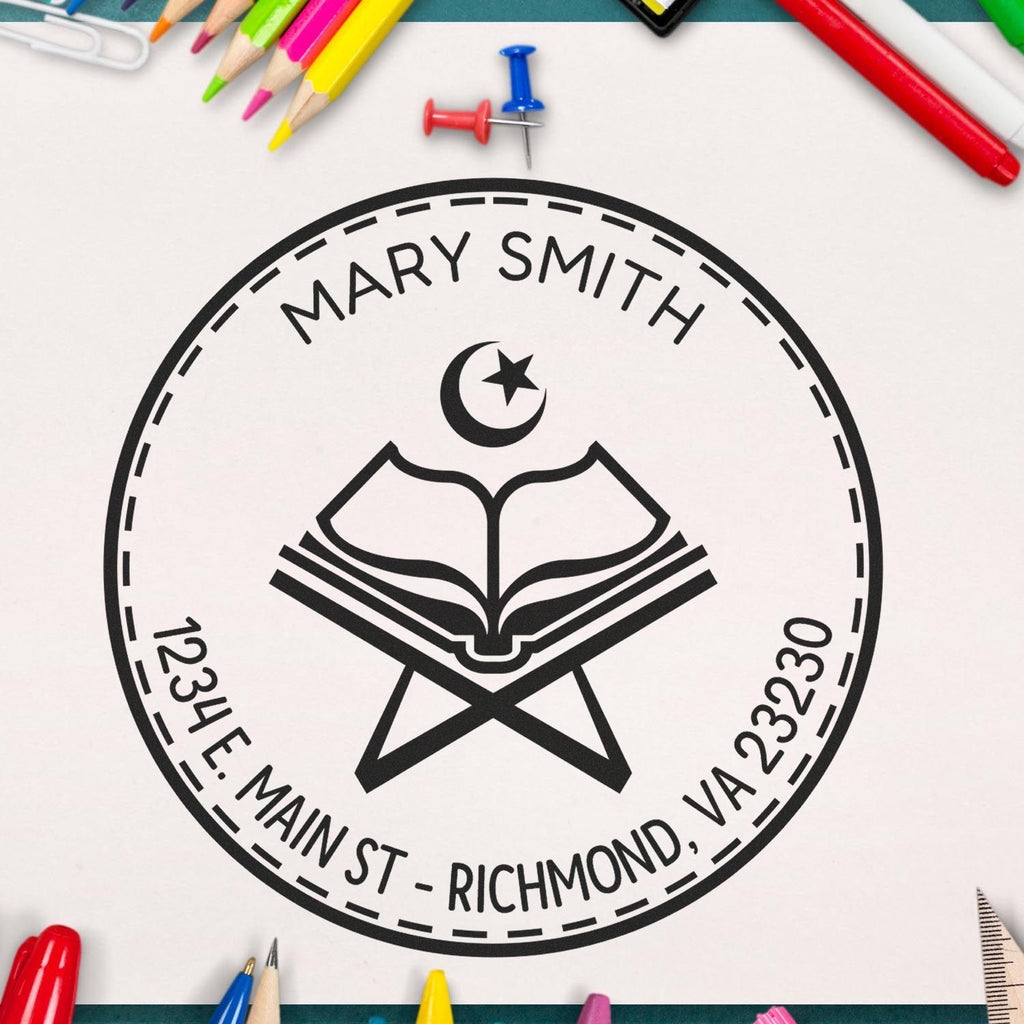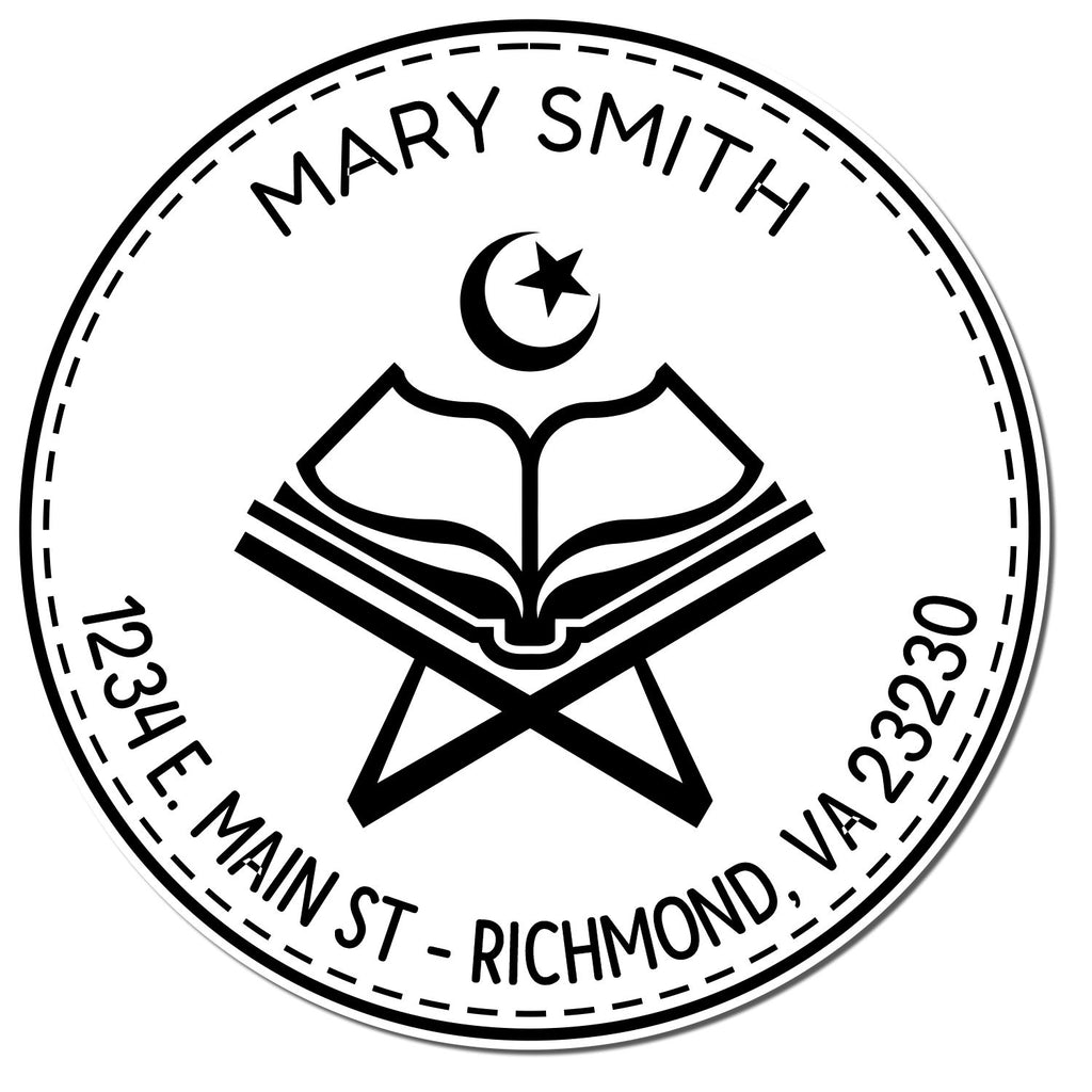 - ELEGANT DESIGN: Beautiful Words open book design with star and crescent moon, featuring a sophisticated double-ring circular border. Personalized with your name and address in an elegant arc formation.