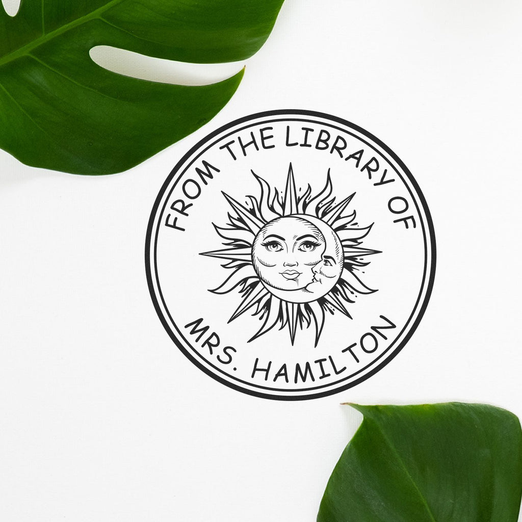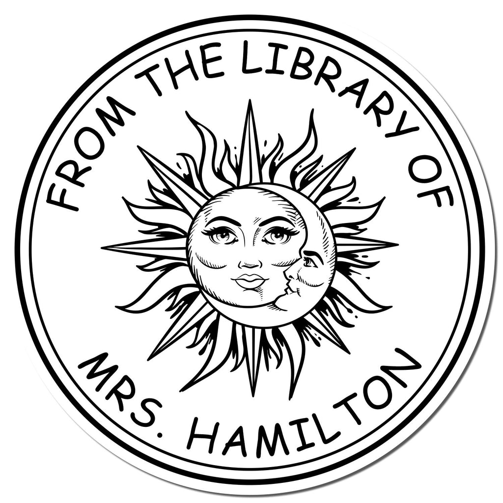 Stunning Design This exquisite book stamp features a captivating center image of a Bewitching Sky Sun with a face, surrounded by a double concentric solid circular border. The words "From The Library of" arc gracefully at the top, while the bottom arc reads "Read it, Love it, Return it". With an impression size of 1-5/8" in diameter, this stamp is not only functional but also adds a decorative element that enhances the visual appeal of your books.