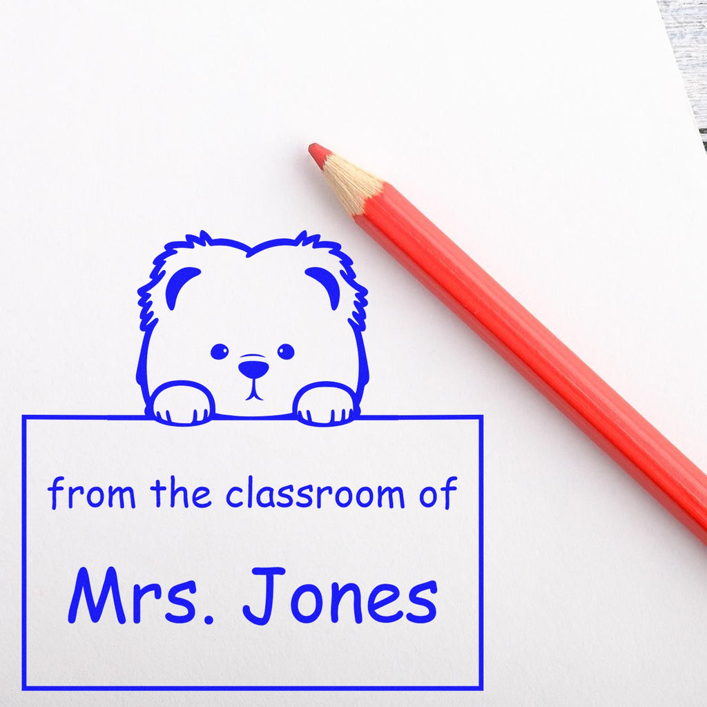 Featuring a delightful Chow Chow puppy design, this stamper captures hearts with its irresistibly fluffy and adorable art. The playful pup peeks over a whimsical line, brought to life with bold outlines and minimal detail that highlight its endearing expression. This design is sure to charm pet lovers and enthusiasts of cute art, making it a delightful addition to any teacher's desk.