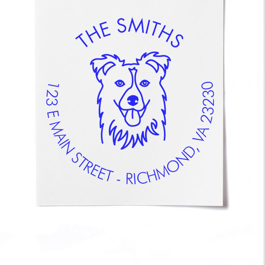 Enjoy a quiet and seamless stamping experience with our advanced flash technology, which ensures crisp, clean imprints every time. The 1-5/8 round design features your name elegantly arranged along the top arc and your address along the bottom, both in a modern, uppercase sans-serif font that is easy to read and visually appealing. This professional look is perfect for any Collie pet owner who wants to add a touch of personality to their mailing needs.