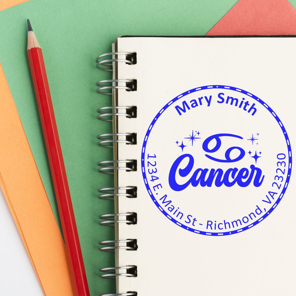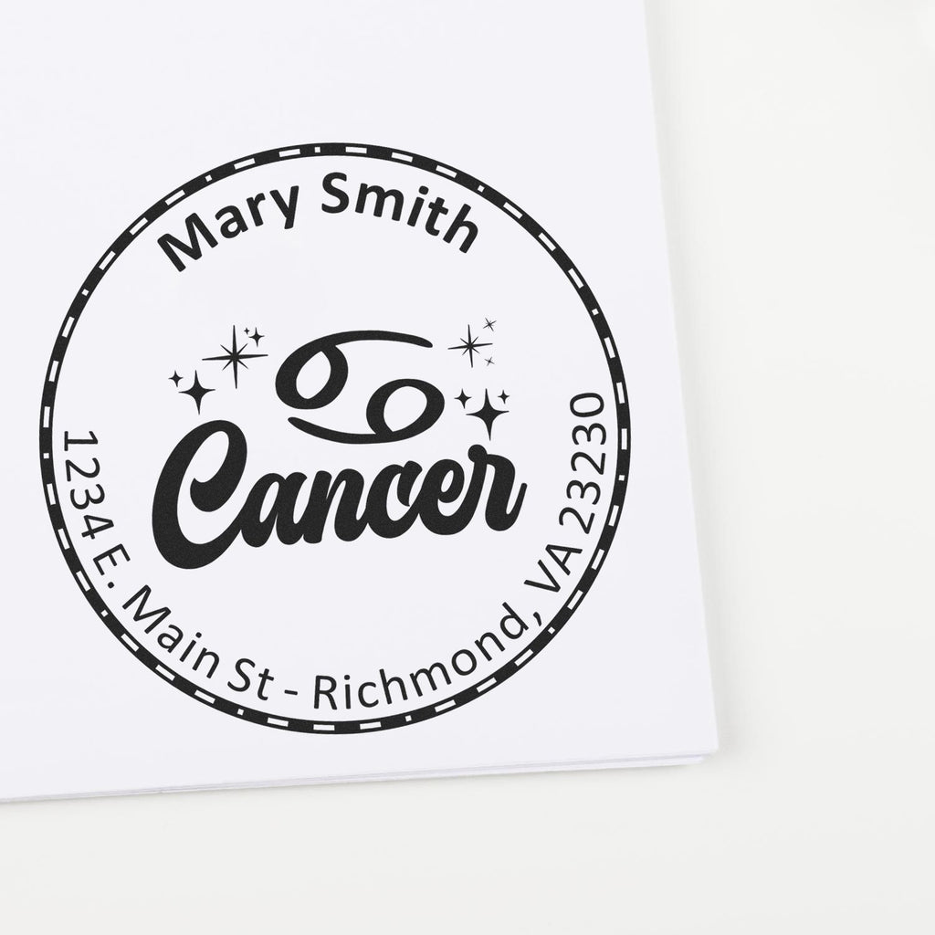 - PERSONALIZED ZODIAC DESIGN: Beautiful 1-5/8" diameter Cancer constellation stamp featuring celestial elements, custom name arc, and elegant script font for a meaningful personal touch.