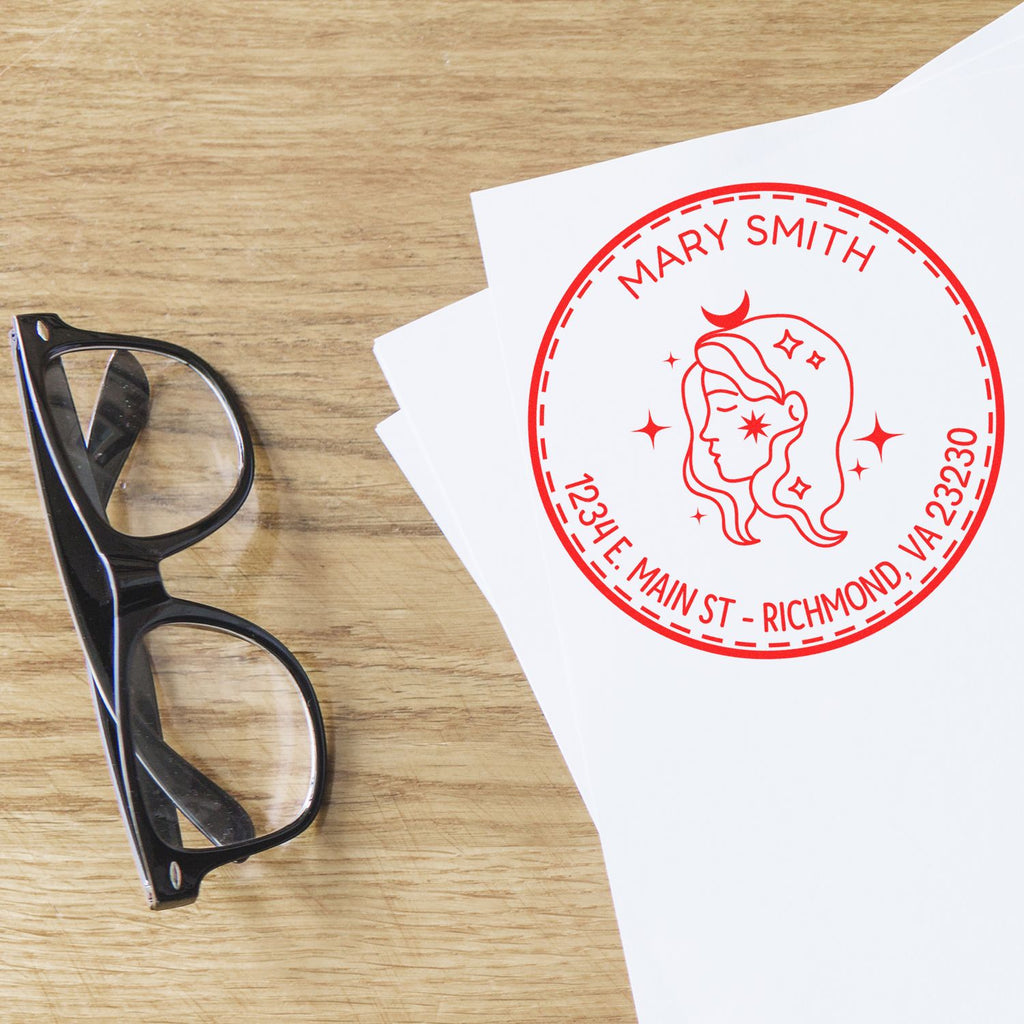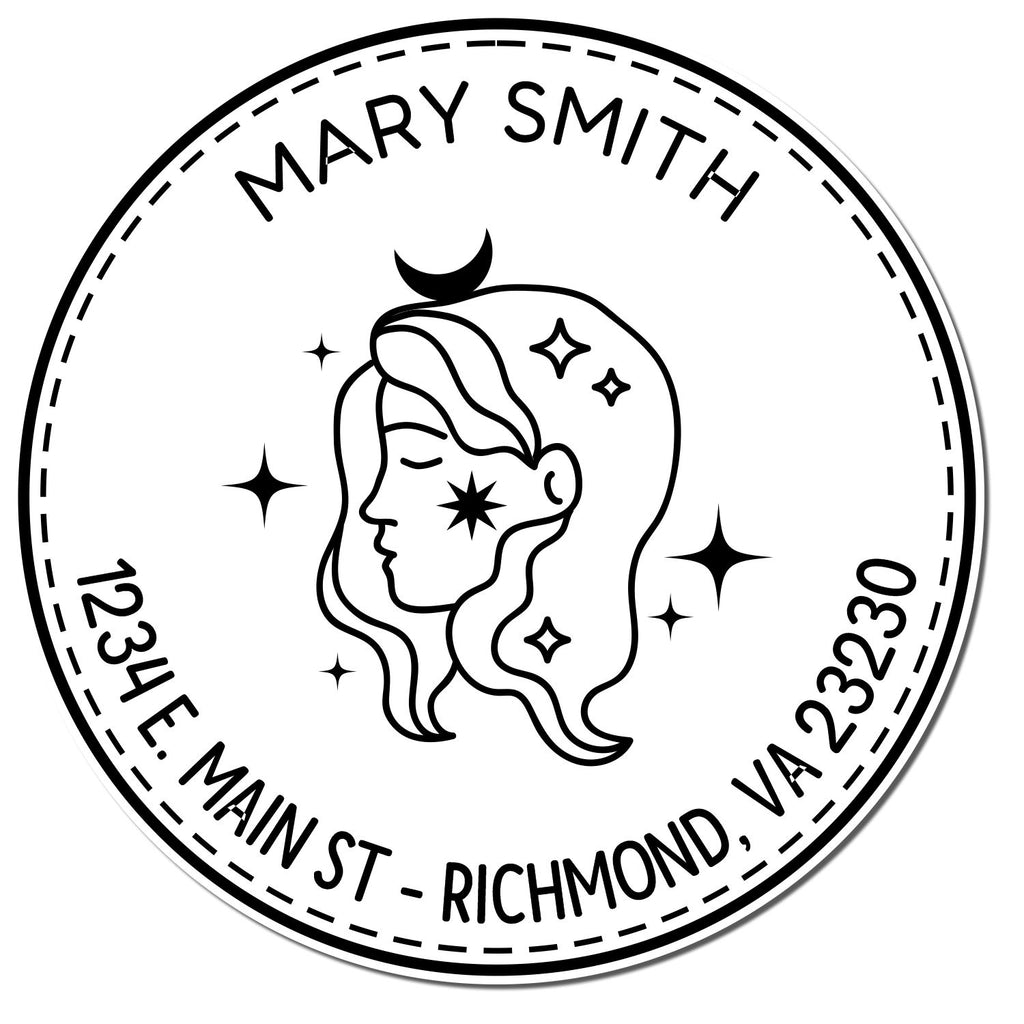 Product Details: - Size: 1-5/8" in diameter - Design: Features a beautiful Virgo zodiac symbol with your name and address in a stylish circular border. - Keywords: Personalized Name And Address Stamper, Customized Name And Address Stamper