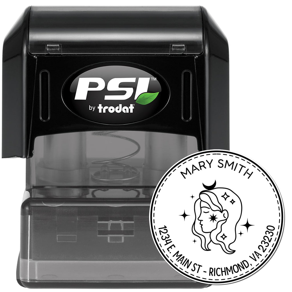 Impressive Quality and Fast Drying Ink Each PSI Pre-Inked Diligent Virgo Custom Return Address Stamper is filled with special ink that produces clear, neat marks that dry quickly. Your papers will look professional and polished, impressing clients and friends alike. The unique design features a beautiful side profile of a girl with the Virgo zodiac symbol at the center, surrounded by a double ring circular border. Your name elegantly arcs at the top, with your address or a personalized saying at the bottom, creating a stunning impression every time.