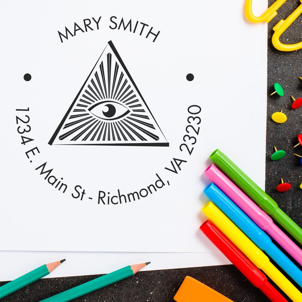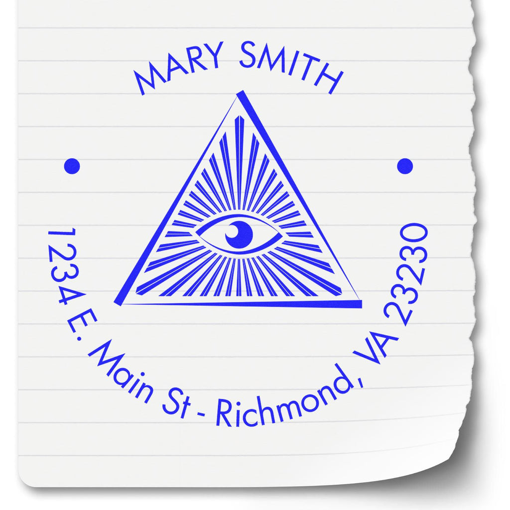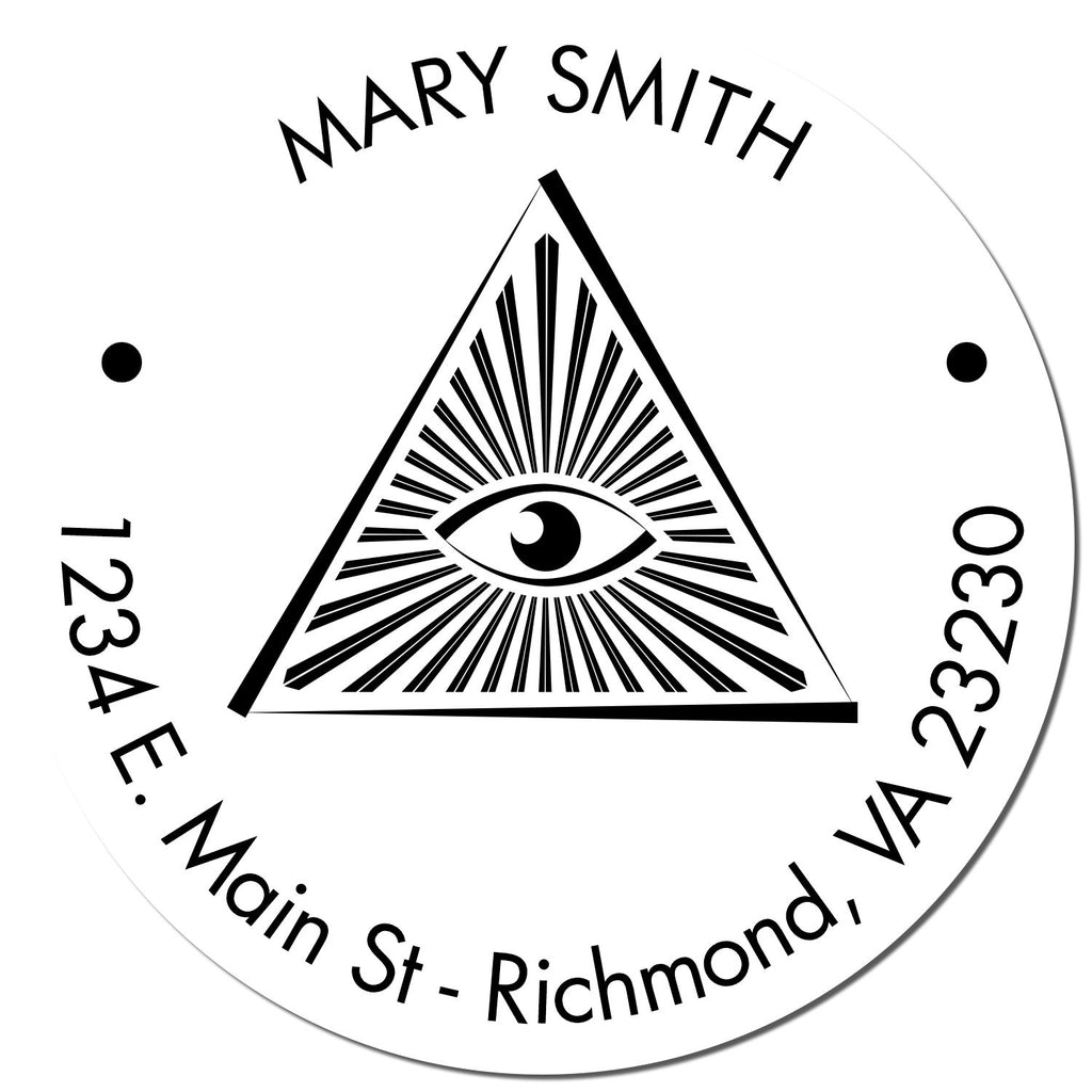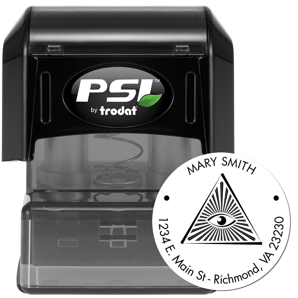 Crisp, Clear Impressions with Every Use Our PSI Pre-Inked Stamps deliver crisp, clear impressions that pop with personality. With a stunning impression size of 1-5/8" in diameter, this stamp features a beautifully designed center image of the Elusive Masons all-seeing eye symbol, surrounded by your name in the top arc and your address or a personalized saying in the bottom arc, separated by two elegant dots. This clean round design not only looks great but also ensures that your return address stands out in a sea of plain envelopes.