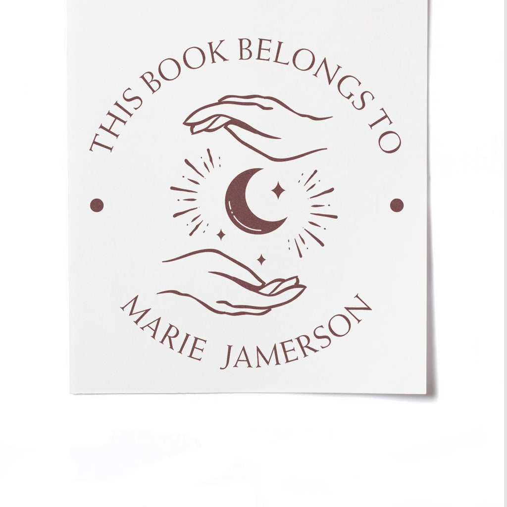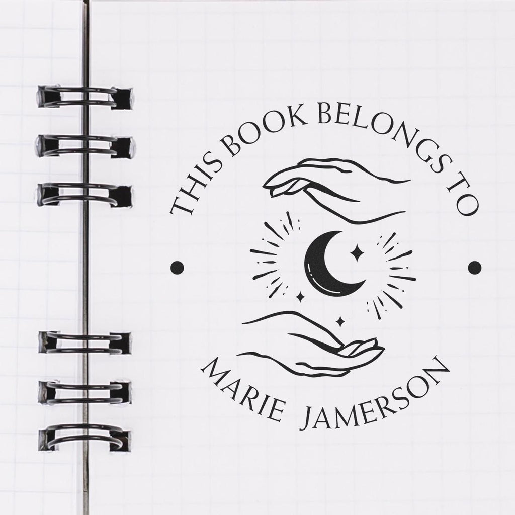Stunning Design and Dimensions The PSI Pre-Inked Enchanting Moon Customized Ownership Stamper features a beautifully crafted design that showcases a center image of an enchanting moon being cupped by two hands. This clean round design includes phrases such as "This Book Belongs To," "From The Library of," and "Ex Libris" at the top arc, followed by your name or another saying at the bottom arc. The top and bottom arc texts are elegantly separated by two dots in the center, creating a balanced and aesthetically pleasing impression. The impression size is 1-5/8" in diameter, making it the perfect size for a variety of uses.