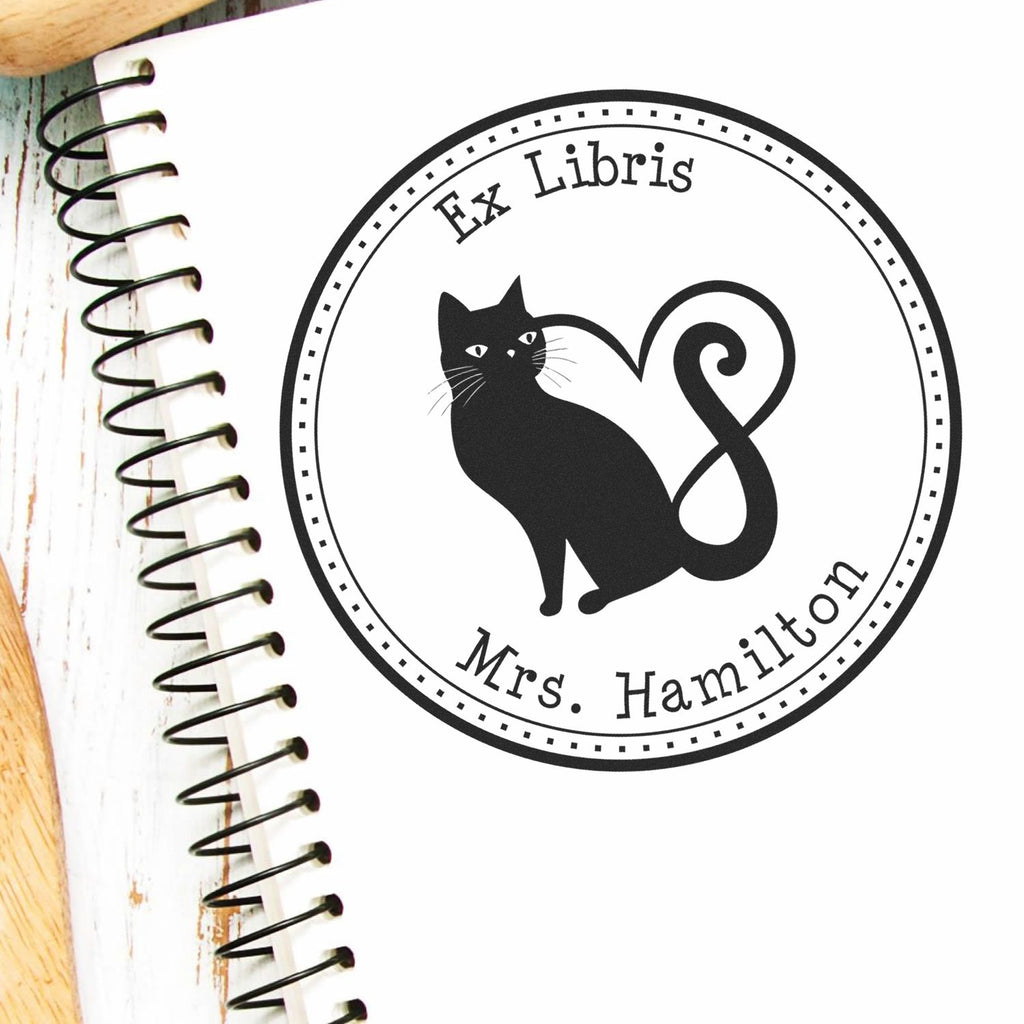 - VERSATILE DESIGN ELEMENTS: Showcases an energetic cat within three elegant border rings, measuring 1-5/8" in diameter. Customizable text arcs allow for personal messages or traditional book ownership phrases.