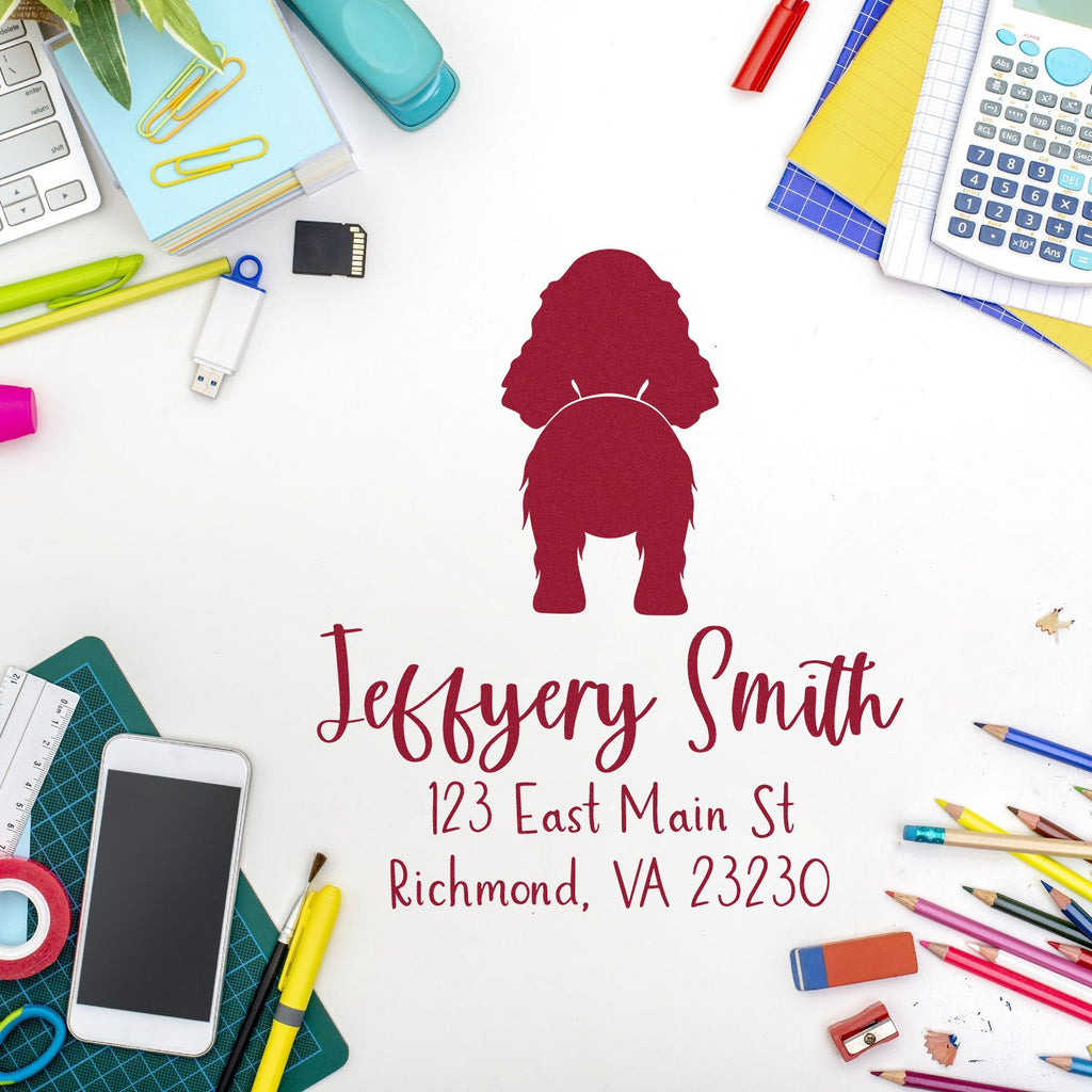 The design features a minimalist, silhouette style of an English Cocker Spaniel from behind, with simple, clean lines that focus on the distinctive shape of the dog's ears, tail, and body. The black and white contrast enhances the simplicity and elegance of the design, making it suitable for a custom stamp. The name is in a stylish, cursive font, giving it a flowing, handwritten appearance, while the address is set in a clean, sans-serif font for clarity. This combination creates a visually pleasing contrast, making your stamp not only functional but also a beautiful addition to your correspondence.