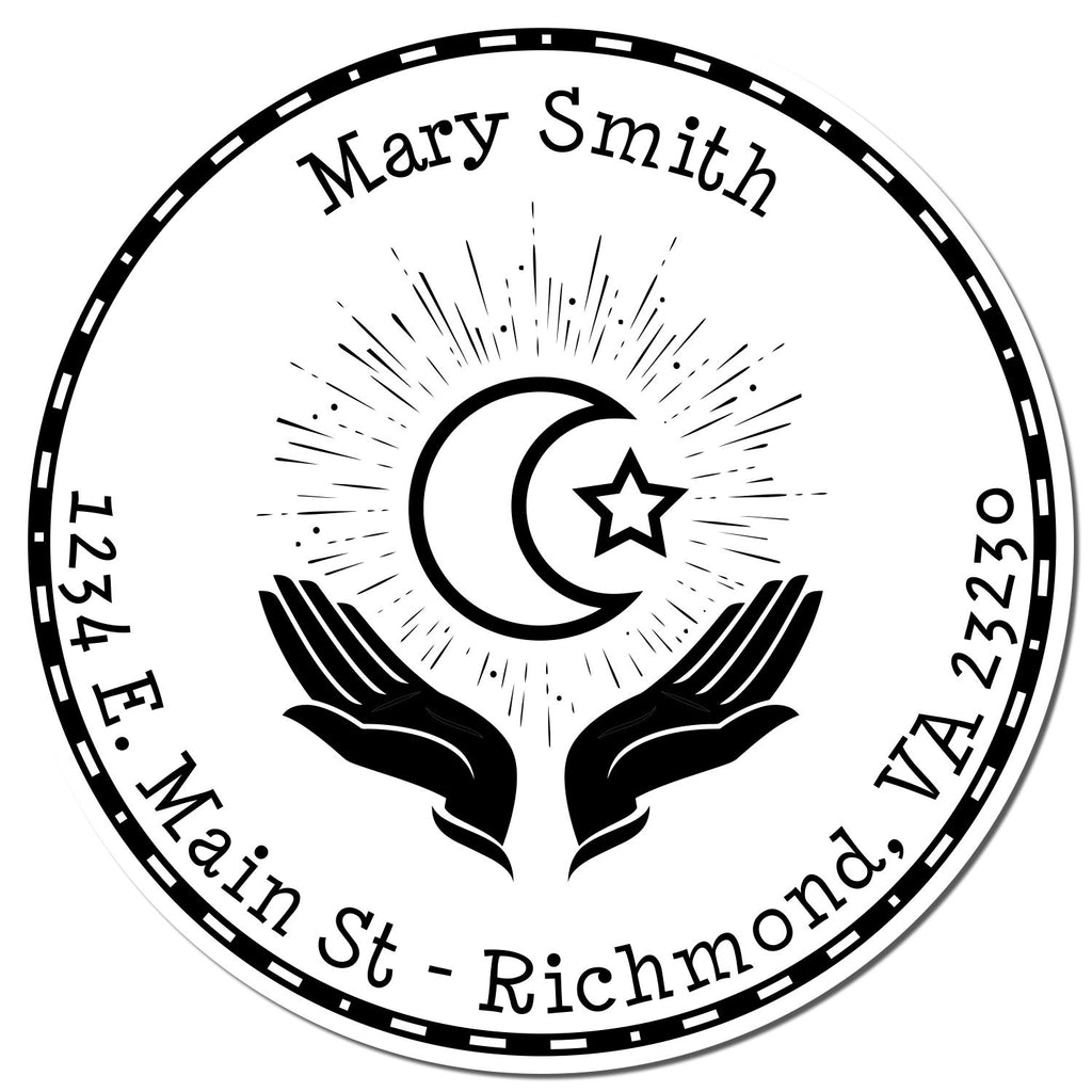 Unmatched Quality and Vibrant Colors The PSI Pre-Inked Evening Prayers Envelope Stamp is not just any stamp; it’s a masterpiece of craftsmanship. Featuring a captivating design of evening prayers with a crescent moon, star, and hands in prayer, this stamp is encircled by a solid circle border adorned with white dashes and dots. Your name elegantly arches at the top, while your address or a meaningful saying graces the bottom arc. With a generous impression size of 1-5/8" in diameter, your messages will stand out beautifully. Choose from 5 vibrant ink colors that align perfectly with your unique style, ensuring that every piece of mail you send is a reflection of your personality and faith.