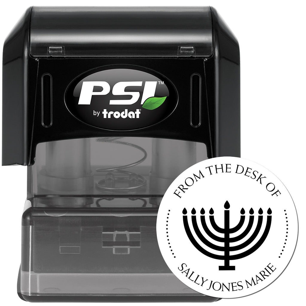 Personalized Touch for Every Occasion The PSI Pre-Inked Festival of Lights Customized Address Stamper features a beautifully designed center image of a Festival of Lights Menorah, surrounded by phrases like "This Book Belongs To," "From The Library of," and "Ex Libris." The clean round design allows you to customize the top arc with your name or a special saying, while the bottom arc text is separated by a charming line of dots. With an impression size of 1-5/8" in diameter, this stamp is perfect for adding a personal touch to your holiday cards, invitations, and more!