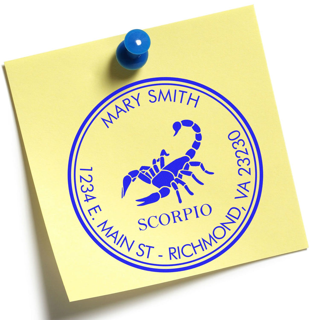 - ASTROLOGICAL ELEGANCE: Showcase your Scorpio pride with this 1-5/8" diameter custom stamp. Double concentric border frames your personalized information beautifully around the striking scorpion centerpiece.