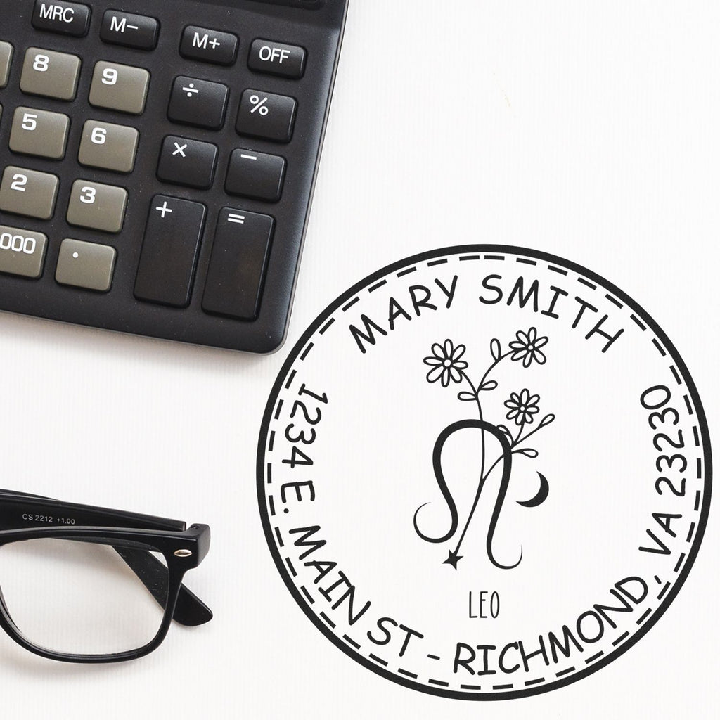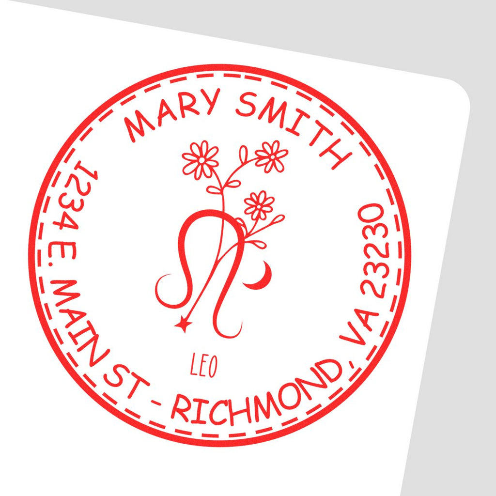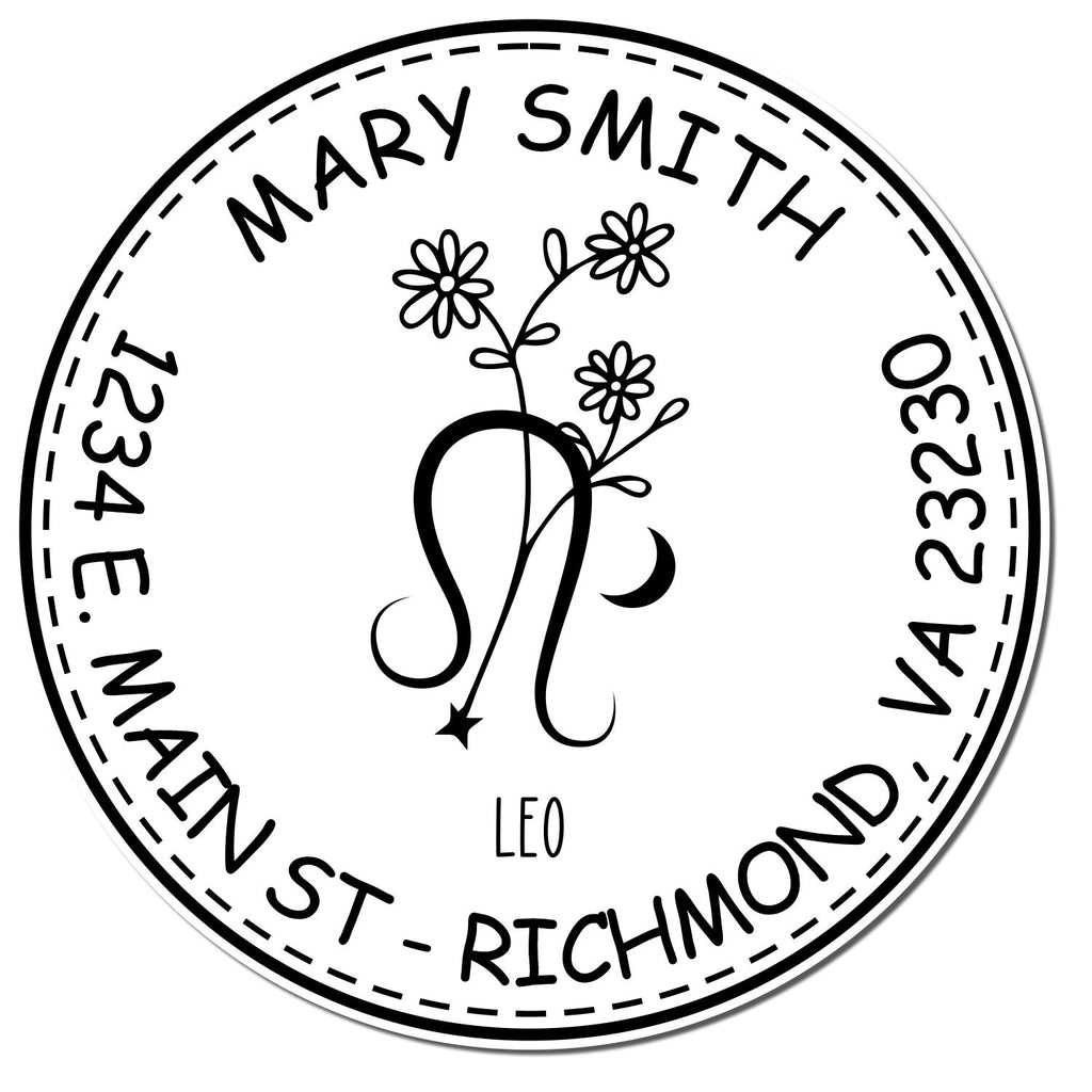 Key Features: - Impression Size: 1-5/8" in diameter - Design: Features a stunning Leo Zodiac symbol with flowers, encircled by a double ring border that adds elegance to your stamping. Your name elegantly arches at the top, with your address or a personalized message at the bottom. - Pre-Inked Technology: Each stamp is filled with high-quality ink that ensures a crisp, clear impression every time. No more smudges or waiting for ink to dry!