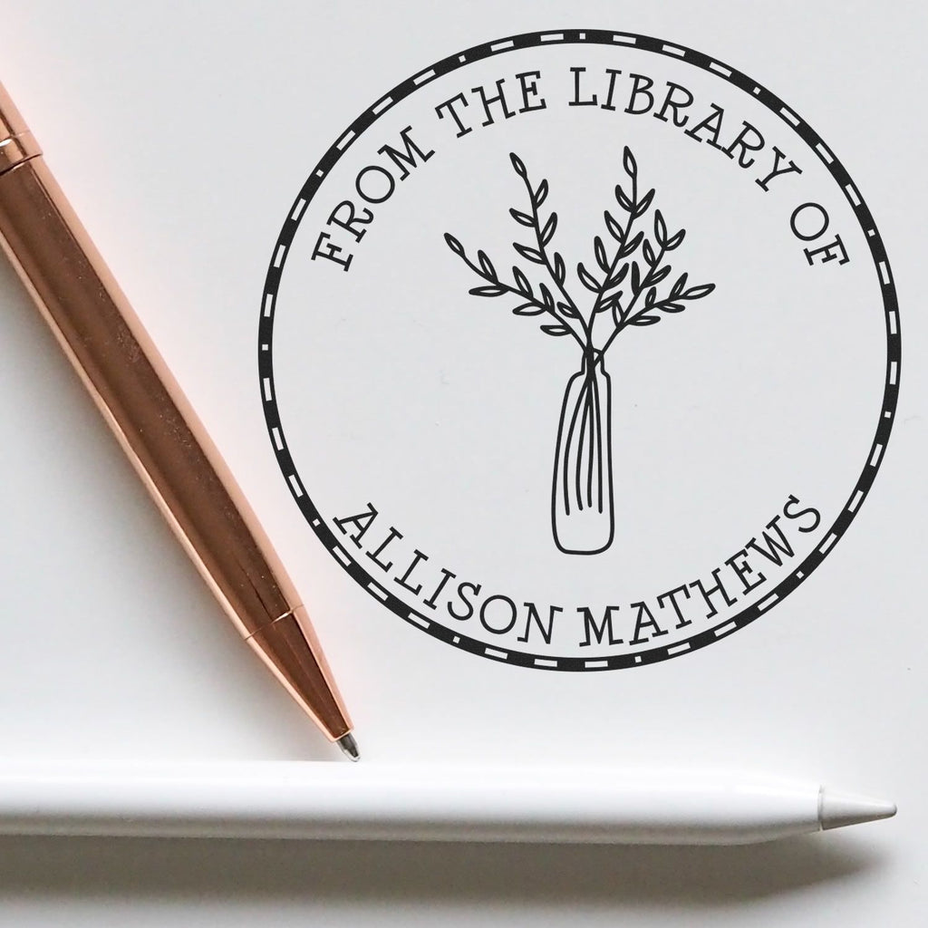 Personalized Ownership Made Easy Make your books truly yours with our "This Book Belongs To" stamp! This customized ownership stamper is perfect for personal, school, or community libraries, helping you easily identify and recover borrowed books. The design features a beautiful center image of a plant in a tall vase, surrounded by a solid circle border filled with white dashes and dots. The phrases "This Book Belongs To", "From The Library of", and "Ex Libris" can be elegantly displayed at the top arc, followed by your name or another saying at the bottom arc. This unique design not only adds a personal touch but also reduces the risk of loss, ensuring your valuable books are always returned.