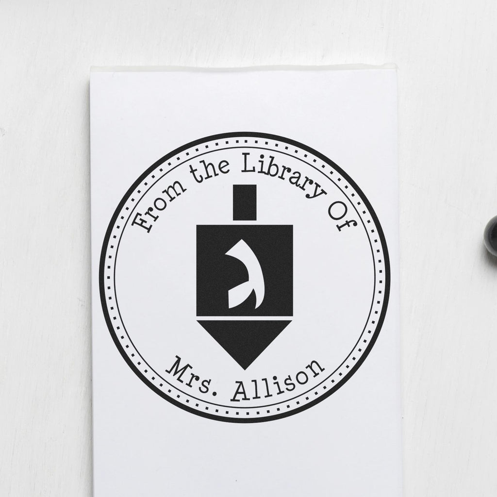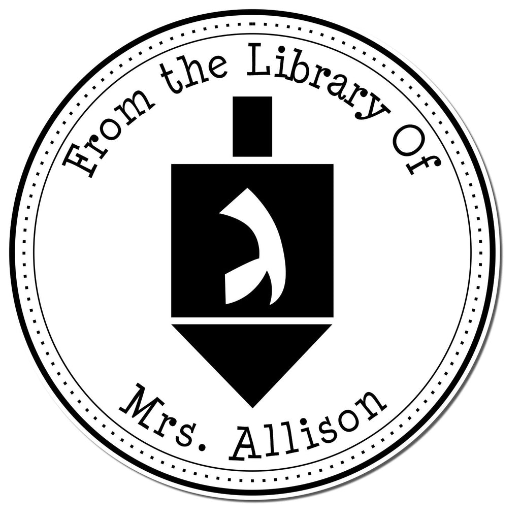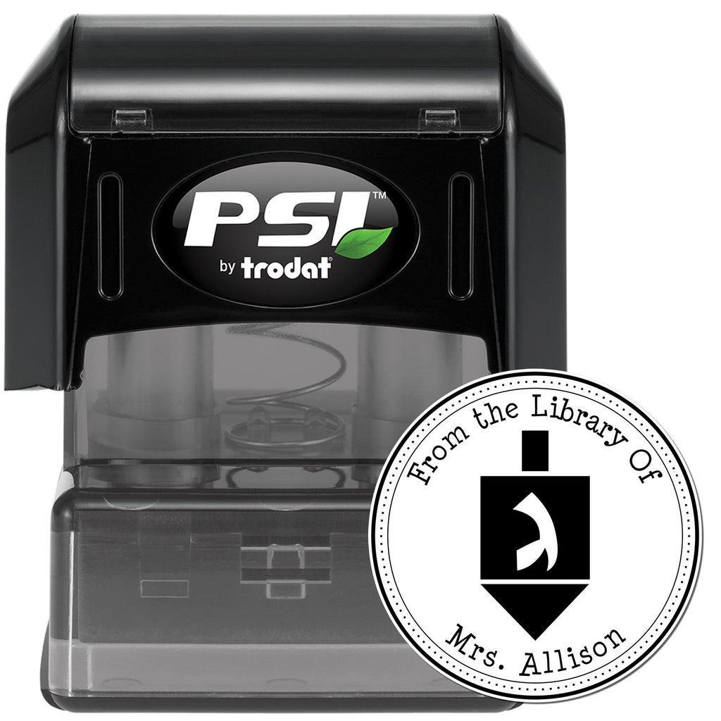 A Design That Speaks Volumes The PSI Pre-Inked Holiday Dreidel Mail Stamp features a beautifully crafted center image of a dreidel, surrounded by a sophisticated three-ring border. The bold circular outer border, complemented by a dotted inner border, creates a stunning visual that captures the essence of the holiday. The phrases "This Book Belongs To," "From The Library of," and "Ex Libris" elegantly arch above your name or a personalized message at the bottom, making it a versatile addition to your holiday stationery. With an impression size of 1-5/8", this stamp is perfectly sized for a variety of uses, from holiday cards to invitations.